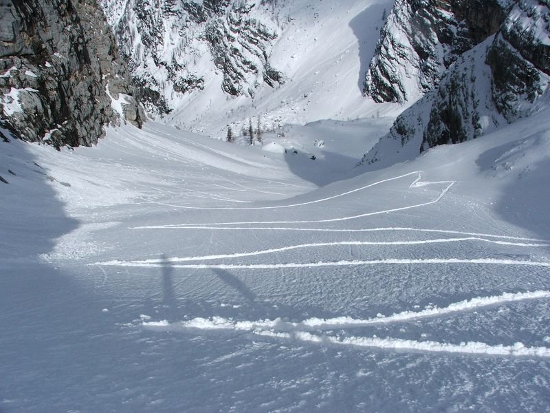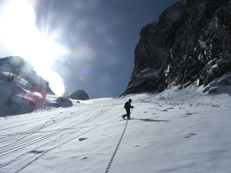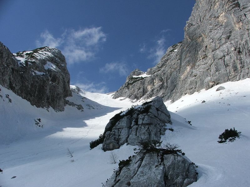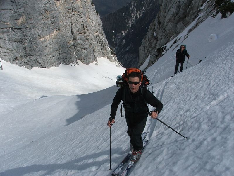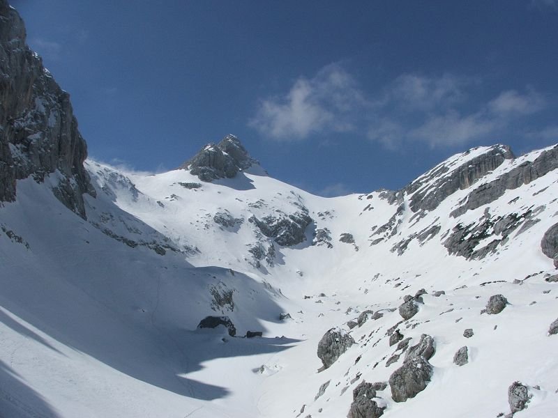 Paradeskitour der östlichen Julischen Alpen! Wie der Name schon sagt, handelt es sich um zwei in Serie geschaltete Kare, die als Krönung noch einen Spitz als Gipfel haben. Das Skigelände ist bis auf die ersten 250 Höhenmeter baumfrei, weist eine perfekte Hangneigung auf und um es letztlich auf den Punkt zu bringen: Weltklasse!
