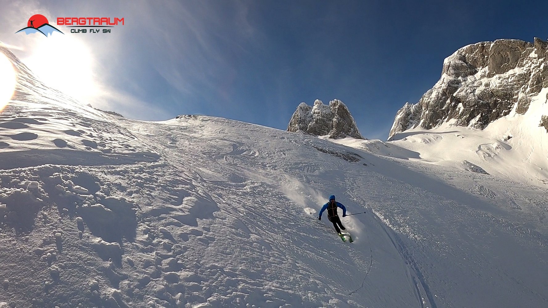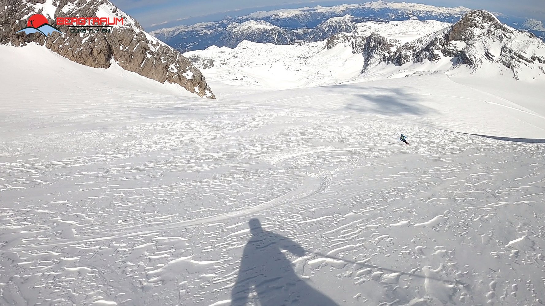 Von der Talstation der Hunerkogelbahn zur Südwandhütte (30min), dann hinter der Hütte etwa 150HM hinunter und weiter nach Westen unter der Dachstein-Südwand entlang bis in die kleine Scharte namens "Tor" (1:15h von der Hütte). Von dort abfahren ins Windlegerkar, rechtshaltend möglichst hoch - je nach Schneeverhältnissen rechts (nördlich) hinüber ins Windlegerkar. Direkt hinauf in die Windlegerscharte (Klettersteig, Steigeisen erforderlich, 1:45h), und auf der anderen Seite etwa 200 HM abfahrend hinunter. Wiederum rechtshaltend etwa 100 HM ansteigen ins Torsteineck (kleine Scharte, bald sieht man die Adamek-Hütte), weiter flach rechtshaltend auf den Gosaugletscher und diesen mit Blick auf den Dachsteingipfel ansteigend bis in die Scharte, von der der Westgrat zum Gipfelkreuz zieht (Klettersteig A/B und leichte Kletterei, 1+; 3h). Vom Gipfel in die nordseitige steile Rinne bis diese in Felsen abbricht. Weiter über Felsstufen bis zum Gletscher (Randkluftanstieg, 140 Hm, teilweise mit Torstahlbügeln versichert, Steigeisen und Pickel erfoderlich, ev. Seilsicherung). Achtung bei der Rankluft! (Statt über den Gipfel kann man auch durch die Steinerscharte - ebenfalls drahtseilversichert - auf den Hallstätter Gletscher gelangen, man spart ca. 1h). Den Ratrackspuren folgend zur Bergstation der Hunerkogelbahn (45 min), an dieser vorbei zum Stollenloch der Austriascharte, dann das Edelgries hinunter zurück zum Ausgangspunkt (45 min). Vorsicht, Einfahrt zur Edelgries sehr steil - evtl. vorher bei der Bergstation nach den Verhältnissen fragen.