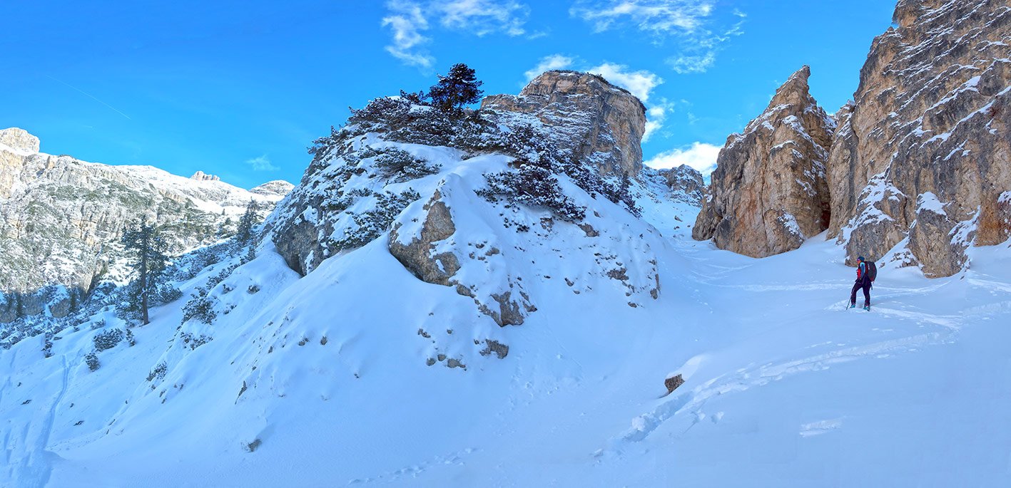 Variante Aufstieg: Beim Aufstieg kann man am Ende vom Rienztal auch rechts vom Sommerweg durch eine steile Rinne auf das Plateau aufsteigen (nur bei sicheren Schneeverhältnissen ratsam).