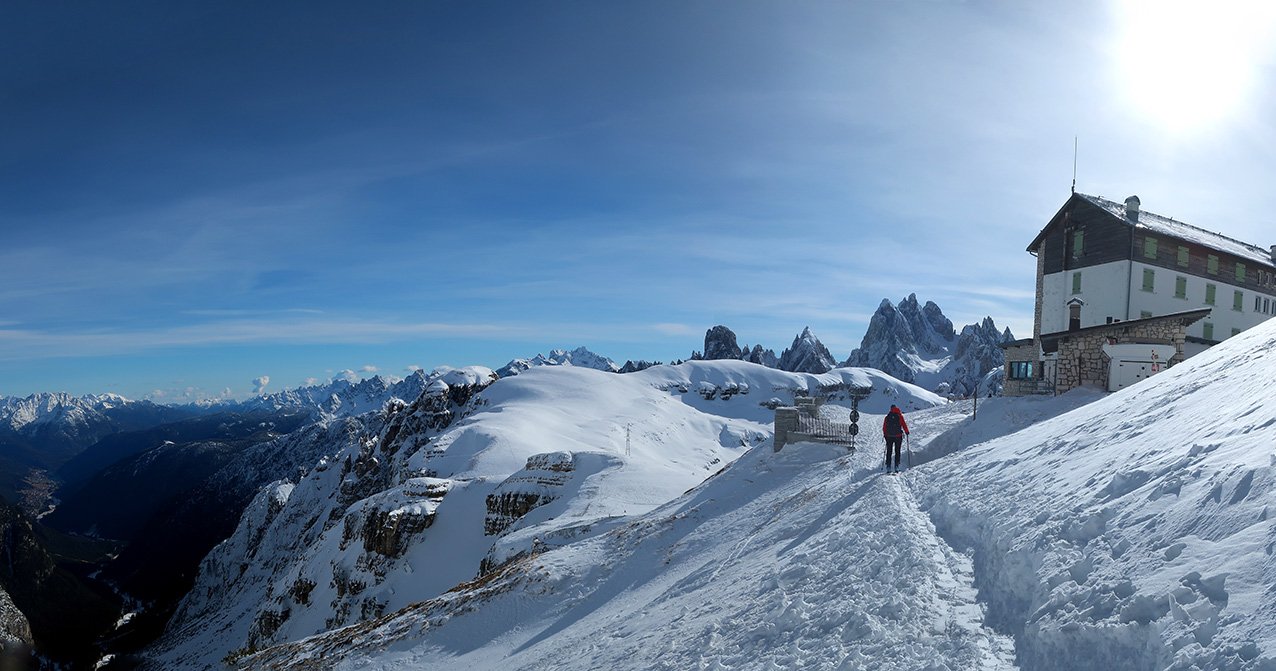 Wer schnell voran kommt, viel Schnee mit guter Spur und sichere Schneeverhältnisse hat, kann beim Aufstieg noch den Abstecher zur Drei Zinnen Hütte (2405 m) und den gleich darüber liegenden Sextner Stein (2539) mit in die Runde einbauen.