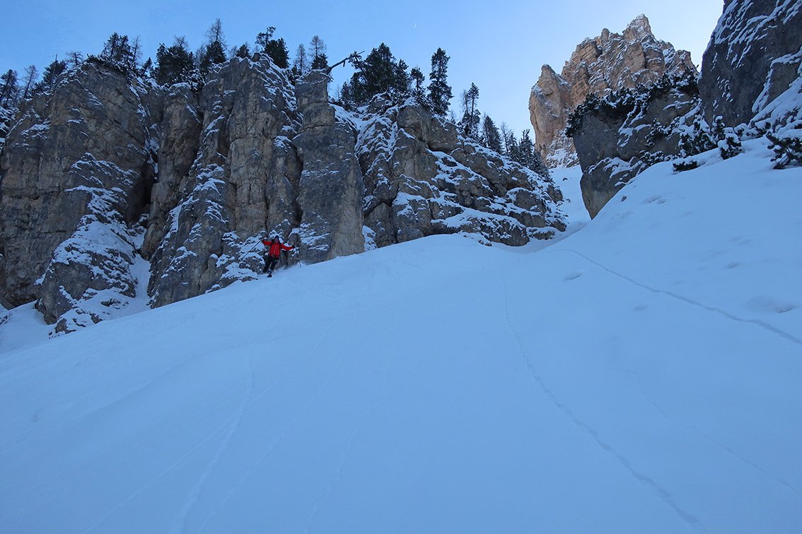 Variante Abfahrt: Man kann auch von der Forcella Col di Mezzo direkt ins Rienztal abfahren, diese Variante ist aber nur bei viel Schnee und sehr sicheren Schneeverhältnissen zu empfehlen. Unten kommt man in eine enge Schlucht, mit (bei wenig Schnee) vereisten Felsstufen. In der Schlucht können die unteren Felsstufen im Abfahrtssinn rechts (auch sehr steil) umfahren werden.