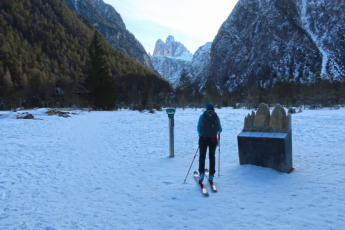 Vom Parkplatz Drei Zinnen Blick anfangs auf dem breiten Fußweg (kurz auch auf der Loipe) dem Sommerweg in das Rienztal folgen. Im Tal immer leicht ansteigend bis in den Talschluss. Dort ist eine sperrende Steilstufe, welche man entweder entlang des Sommerwegs oder rechts, in einer steilen Rinne überwinden kann. Je nach evtl. vorhandener Spur oder Schneelage bietet sich eine dieser Varianten an. Oben auf dem Plateau steuert man auf den Paternkofel zu, schwenkt aber dann nach rechts zum Paternsattel (2454 m). Der letzte Hang hinauf zum Paternsattel ist steil, oben auf dem Sattel ist quasi der höchste Punkt der Drei Zinnen Umrundung erreicht. Auf der Südseite fährt man, vorbei an der Lavaredohütte (2344 m), bis zur Alpini Kapelle ab. Dort - oder noch etwas später - zieht man die Felle wieder auf die Ski und geht auf dem Fahrweg zur Auronzohütte (2320 m). An der Hütte vorbei, im Bereich des Wanderweges weiter bis zur Forcella Col di Mezzo (2324 m; siehe auch Bemerkung). Von dieser Scharte auf eine kleine Anhöhe westlich davon, dort fellt man ab und fährt - je nach Schneelage wegen der Latschen problematisch - zur Forcella dell Arghena (2087 m) ab. Dort dann nördlich, steil in Richtung Rienztal abfahren, im Mittelteil (Wald) hält man sich links und erreicht teilweise freie Steilhänge, über die man dann zu flachem Gelände abfährt. Unten über den Rienztalbach zur bekannten Aufstiegsspur und auf dieser zurück zum Parkplatz Drei Zinnen Blick.