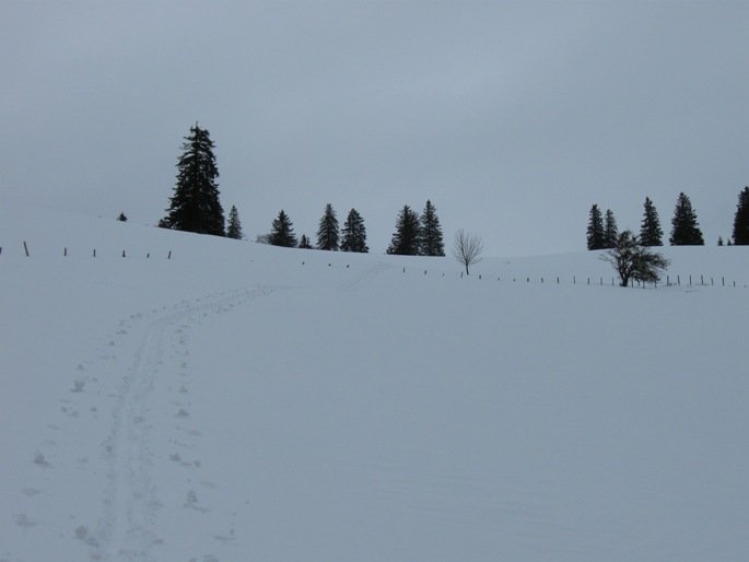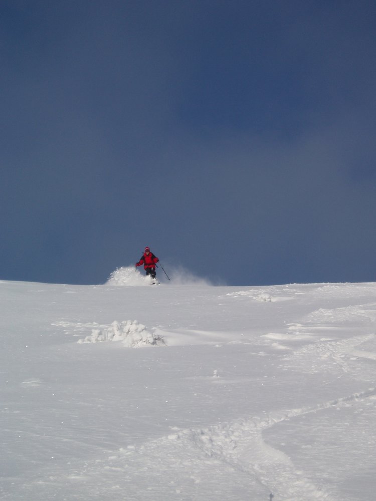 Abfahrt: Dem Gipfelhang direkt zur Aufstiegsspur abfahren. Bei viel Schnee weiter im Graben, sonst über die Ausstiegsspur zurück zum Ausgangspunkt.