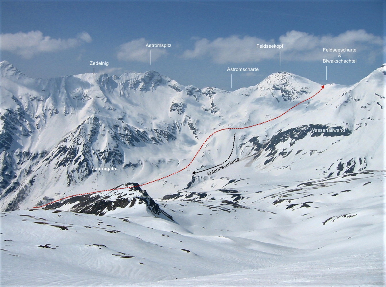 Schöne Skitour in den Hohen Tauern, die mit baumlosen Skiterrain und Blick auf die Tauernkönigin besticht. Neben der hier beschriebenen Skitour finden sich im Tauerntal noch weitere Skitouren, die in den letzten Jahren zahlreich besucht werden. Die Skitour endet in der Feldseescharte, wo eine kleine Biwakschachtel steht. Wenn man noch motiviert ist, kann man über die Südrinne zum Vorderen Geißlkopf (2974m) aufsteigen. An dieser Stelle ist noch zu erwähnen, dass der erste Teil der Tour über eine Forststraße führt, die im Winter als Rodelbahn genutzt wird. Deshalb kann man zu dieser Jahreszeit nur den unteren Parkplatz benutzen. Sobald die Straße auszuapern beginnt, kann man weiter hinauf fahren. In der „Rodelzeit“ kann man sich allerdings mit einem Taxishuttle entgeltlich hinauf bringen lassen.
