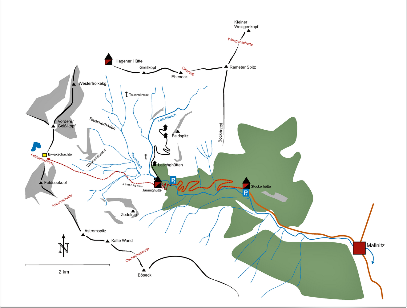 Vom Parkplatz bei der Stockerhütte über die Straße zum oberen Parkplatz knapp unter der Jamnighütte. Wenige Meter vor dem Parkplatz führt ein Brücke über den Bach und weiter bis zur Jamnighütte (1748m). Nun über den flachen Boden in westlicher Richtung weiter. Die Feldseescharte ist bereits gut einsehbar und so folgt man dem steiler werdenden Geländeverlauf nach oben.