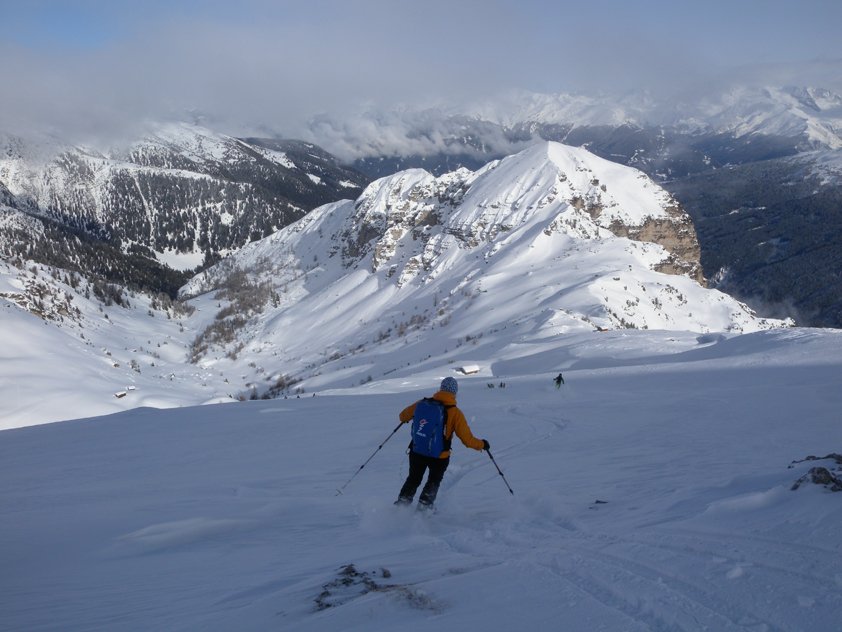 Abfahrt wie Aufstieg. Oder man fährt zum Padasterjochhaus und besteigt noch den Padasterkogel (ca. 170 Hm ab der Hütte) und fährt dann direkt ins Tal. Bei dieser Abfahrt über schöne Hänge hinunter zu Almhütten, dann aber links auf ca. 1900m wieder auf einem Forstweg zurück zur Hüttenzufahrtsstraße.