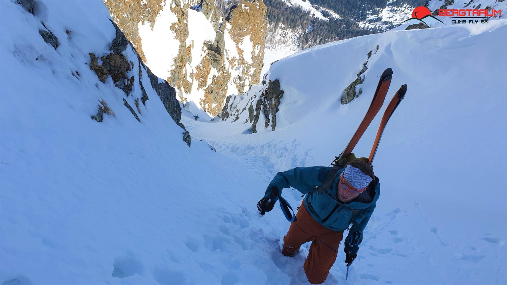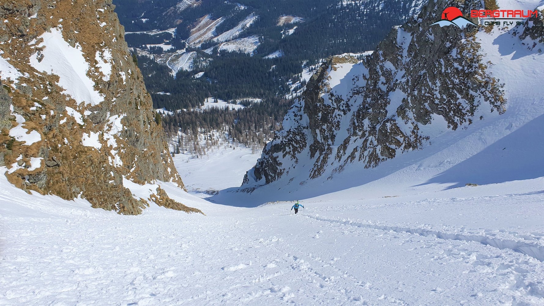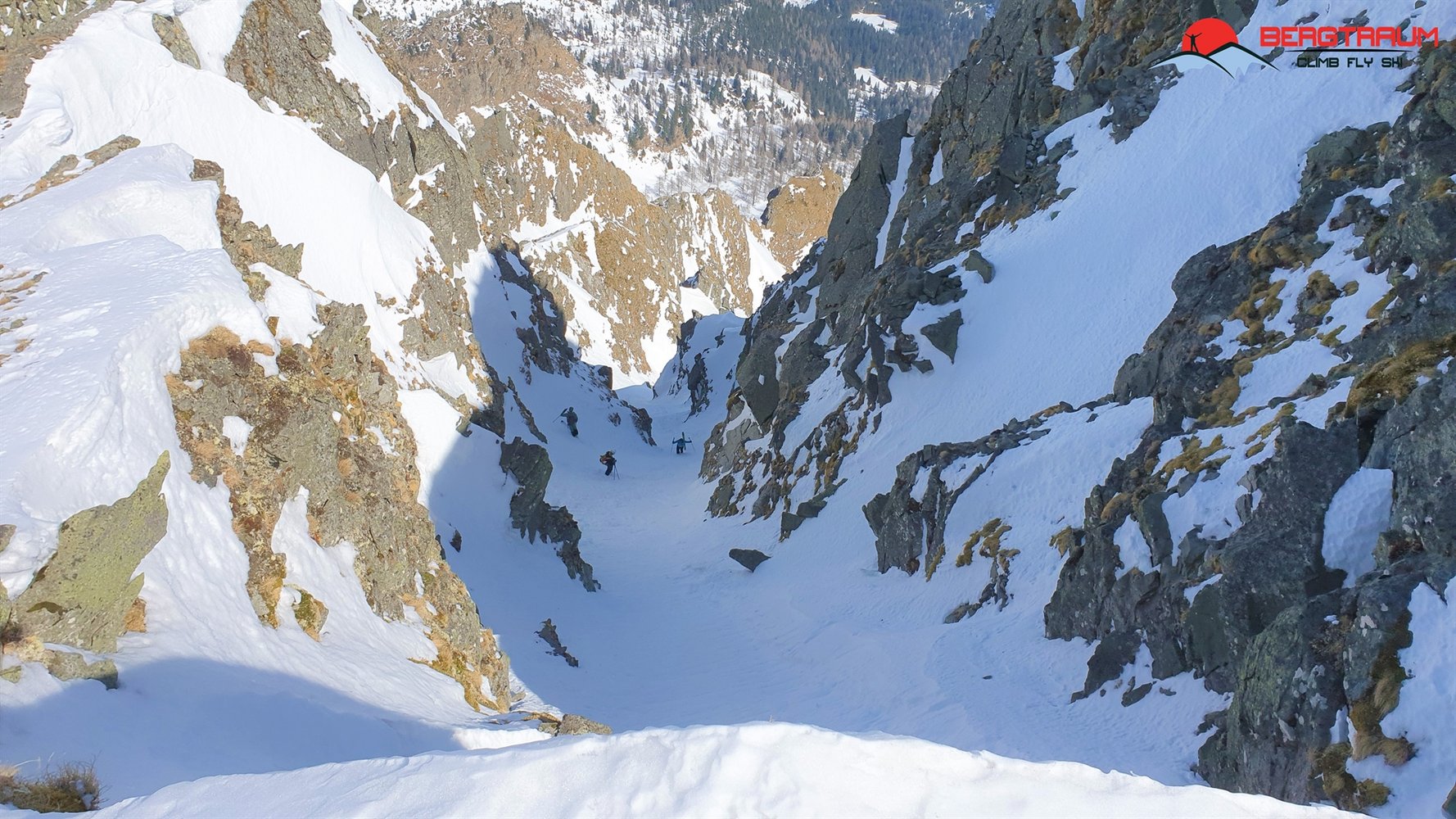 Sehr steile Rinne und nur bei absolut sicheren Schneebedingungen zu begehen bzw. zu befahren. Der Ausstieg (50- 55°) ist oft überwechtet und meist hart gefroren- eventuell Seilsicherung für die ersten Meter notwendig.