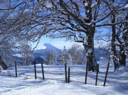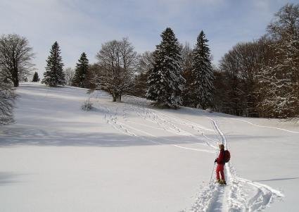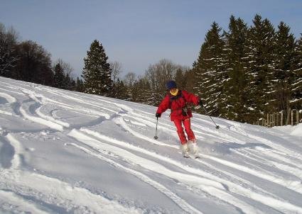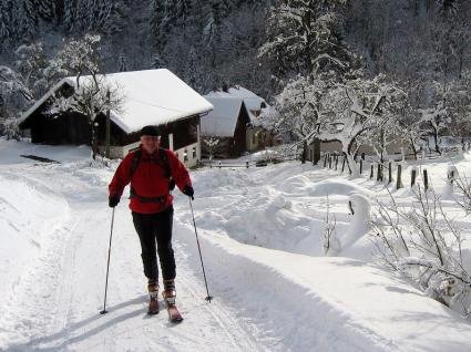 Abfahrt oben im wesentlichen wie Aufstieg. Über die Wiese unter dem Gehöft bis zum Waldrand und dann in einem weiten Rechtsbogen über weitere Wiesen, die man im Aufstieg nicht berührt, zurück zum Ausgangspunkt. Die Abfahrt im unteren Teil durch den Wald entlang der Aufstiegsroute empfiehlt sich nur bei sehr hoher Schneelage.
