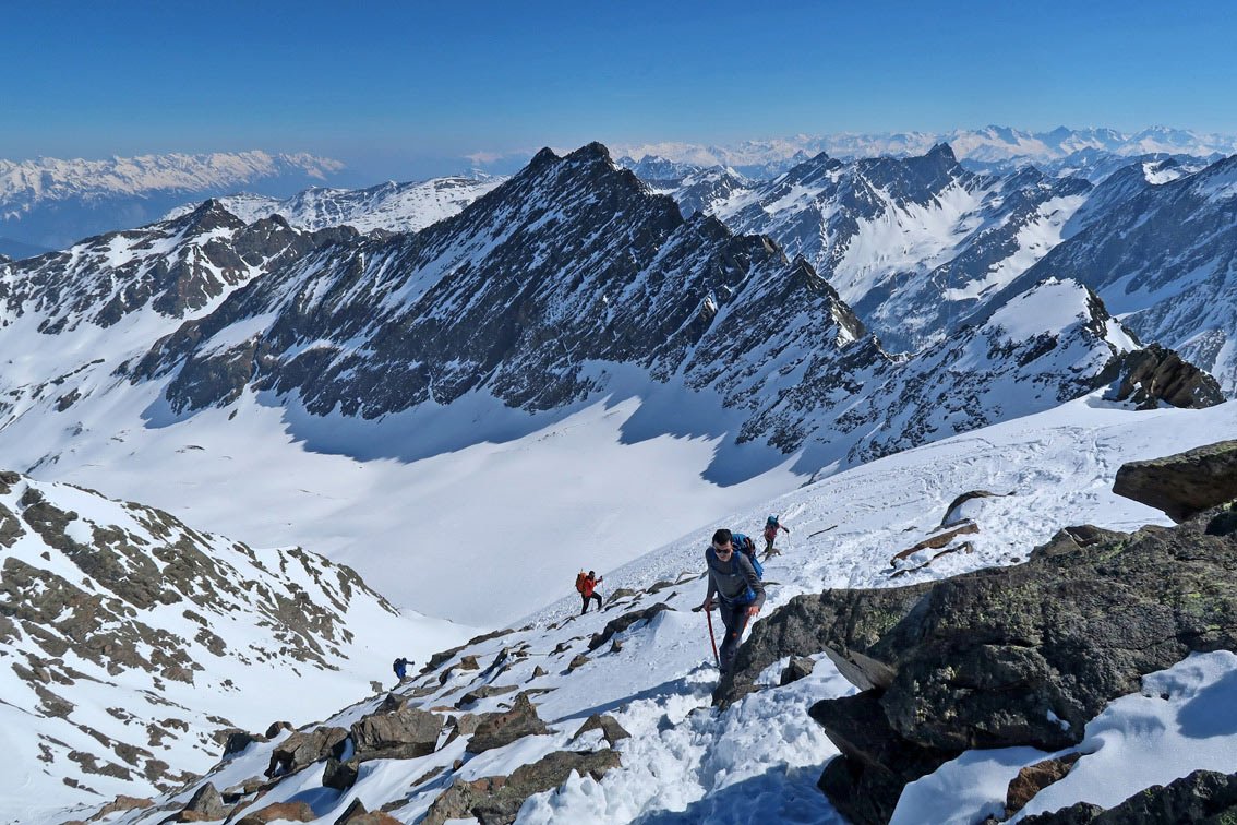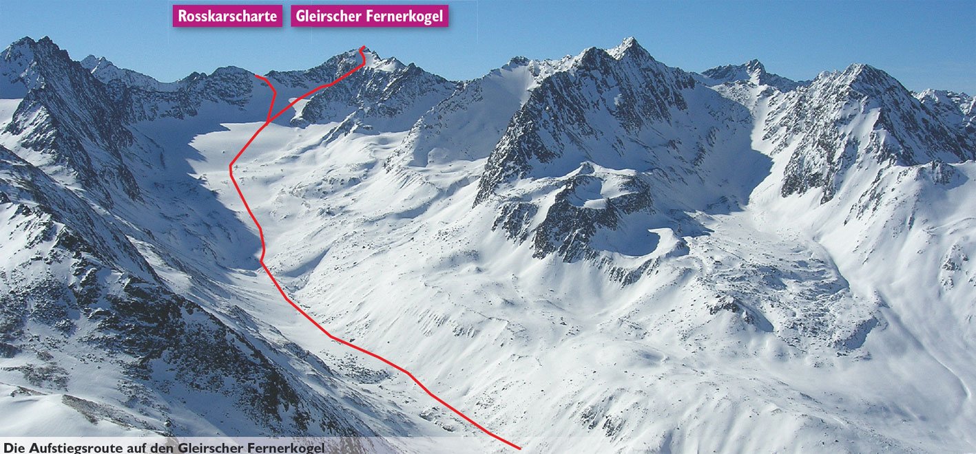 Vom Parkplatz auf der Forststraße (bis zur Gleirscher Alm Rodelbahn, dann meist mit dem Ratrac gewalzt) bis zur Materialseilbahn der Pforzheimer Hütte. Wer in der Hütte übernachten will, steigt dort rechts zum Schutzhaus auf. Konditionell starke Tourengeher bleiben auf dem Talgrund, gehen taleinwärts und hinten auf den Gleirscher Ferner. Auf dem Ferner weiter bis unter den felsigen Gipfelaufbau. Am rechten Rand des Gletscherbeckens steigt man rechts der Gipfelfelsen durch eine steile Rinne hinauf zur Gipfelrampe, der man nach links zum höchsten Punkt folgt. Die Rinne und die Gipfelrampe sind steil und man geht meist zu Fuß, wenn man aber die Skier mitnimmt, kann man bei guten Verhältnissen vom Gipfel abfahren. Variante Rosskarscharte: Wenn die Gipfelrinne zu abschreckend ist bzw. bei ungünstigen Verhältnissen kann man links von der Gipfelwand zur etwas flacheren Rosskarscharte, 3053 m aufsteigen.
