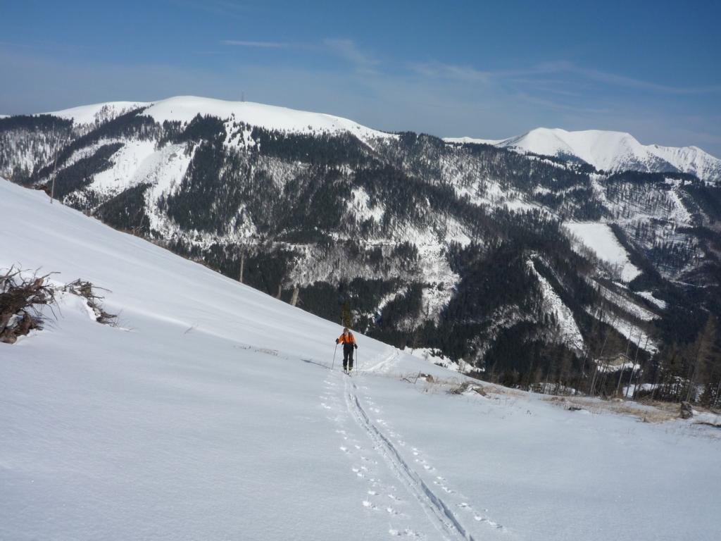 Aufstieg: Knapp 100 m südlich vom Ort Frein zweigt nach Westen eine Forststrasse ab. Man folgt ihr (wobei man links durch den Wald abschneiden kann) bis zur 3. Kehre. Dort nicht nach rechts, sondern gerade weiter bis die Straße dann am Ende des rechter Hand liegenden Hammergrabens unter einem Steilaufschwung nach rechts geht. Bei der ersten flachen Möglichkeit kann man links durch den Wald bis zum Kamm abkürzen. Dort trifft man auf einen komfortabel ausgestatteten (Ofen etc.) Hochstand, unter dem man südwestlich leicht absteigt und auf den folgenden freien Hang zum Kamm gelangt. Auf diesem weiter bis zum Gipfel. Vom Gipfel dem Kamm zum Hintereren Proles folgen und nun entweder sehr steil (Achtung große Lawinengefahr) in die Krautgärten abfahren oder kurz zu Fuß, westlich, steil den Kamm entlang absteigen und dort, auch sehr steil im Wald in die Krautgärten, abfahren. Nun den Kamm weiter bis zum Kleinen Köngiskogel zur Köngisalm und über den flachen Rücken, südlich der Dürriegelalm, auf das Buchalpenkreuz (1402 m). Von dort über den Herrenboden in die flache Scharte zwischen Schneekogel und Hochschnäbelkogel. Nun anfangs in nordwestlicher Richtung auf den Sonntagskogel und den Tonion. Abfahrt zurück zum Sonntagskogel und davor links, in das immer enger werdende Jodelloch, bis man zum zweiten Mal auf die Forststraße trifft. Dieser bis ins Tal folgen und durch den Arzgraben und den Bärenboden auf die Hohe Student (1539 m). Über den Leirerboden und den Ochsenhalterstein in nordöstlicher Richtung dem Kamm folgen und nach dem Ringboden, kurz nach süden und durch eine Rinne und den Wald zum Freinsattel. Von hier über den Gsenger auf den Westrücken der Wildalpe und über diesen zum Gipfel. Vom Gipfel über den Ostrücken zur Hochalm und je nach Verhältnissen früher oder später (anfangs steil) südöstlich nach Frein abfahren.