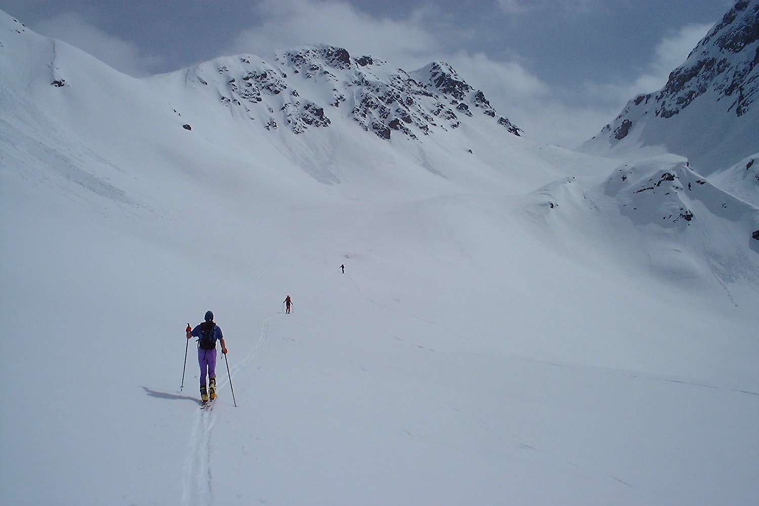 Vom Kartitscher Sattel ins Schöntal und über eine Steilstufe am Weitenstall vorbei zur Filmoor-Standschützenhütte aufsteigen. Nun weiter zum Filmoorsattel, ab hier an den Felswänden bis zur kleinen, schrägen Rampe queren. Hier meist Skidepo und zu Fuß bis zum Gipfel weiter. In der Rampe gibt es Versicherungen, diese liegen aber meist unterm Schnee.