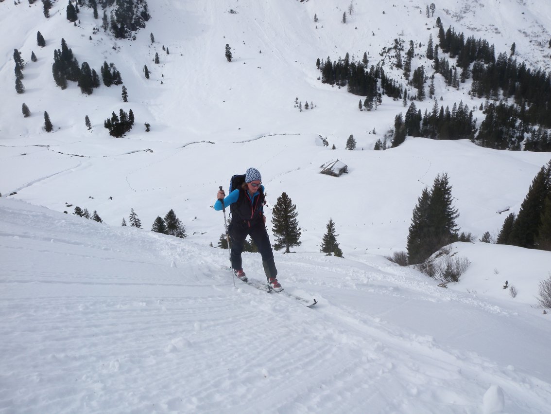Abfahrt wie Aufstieg. Alternativ kann man auf dem Kamm bis zur markanten Scharte unterhalb des Gressensteins fahren, dort dann westlich hinunter zur Filzalm (meist ist dort der Pulverschnee etwas besser).