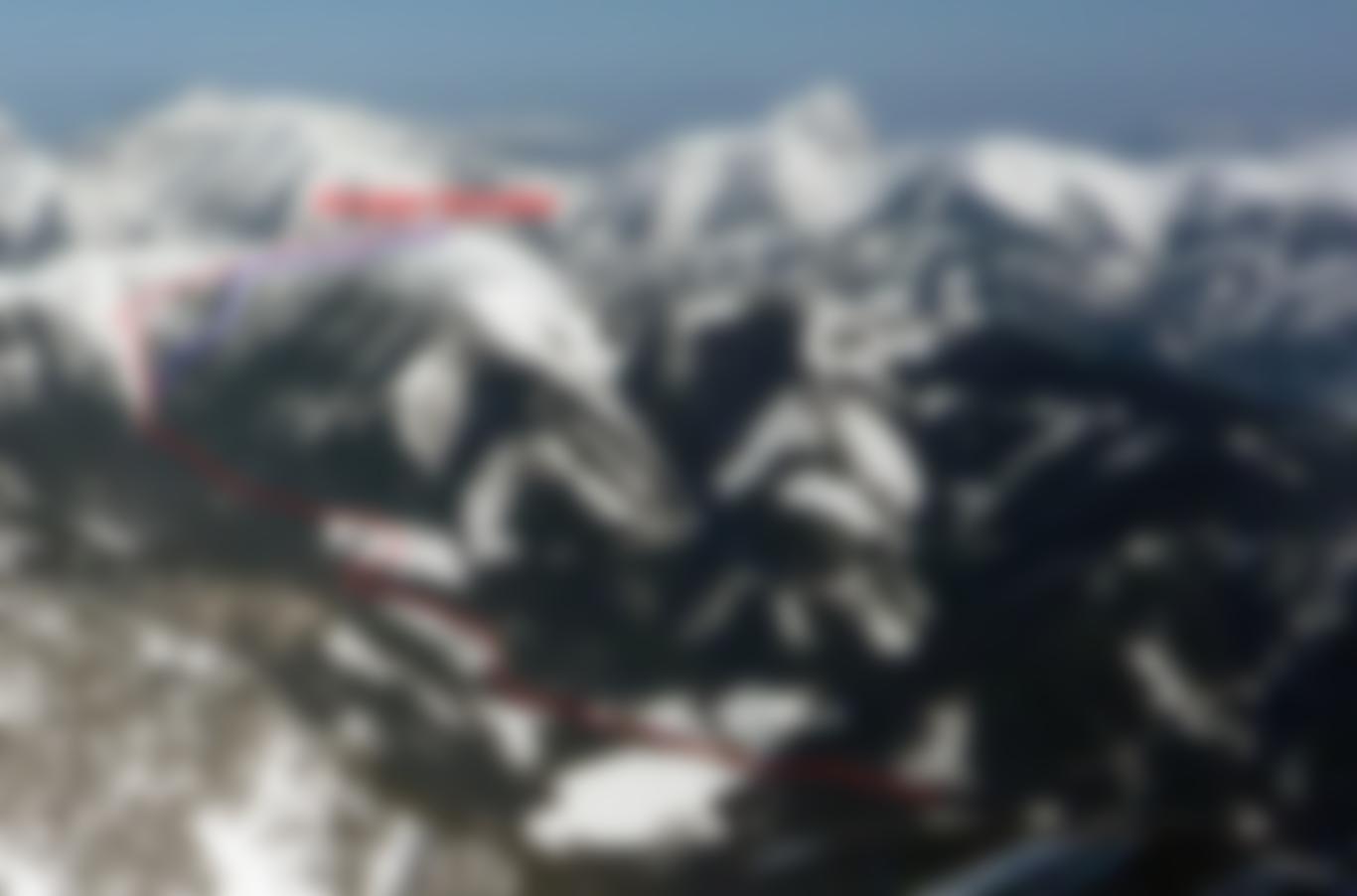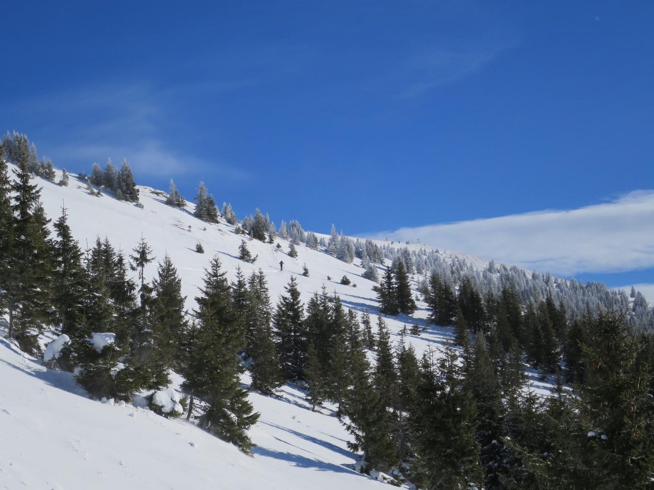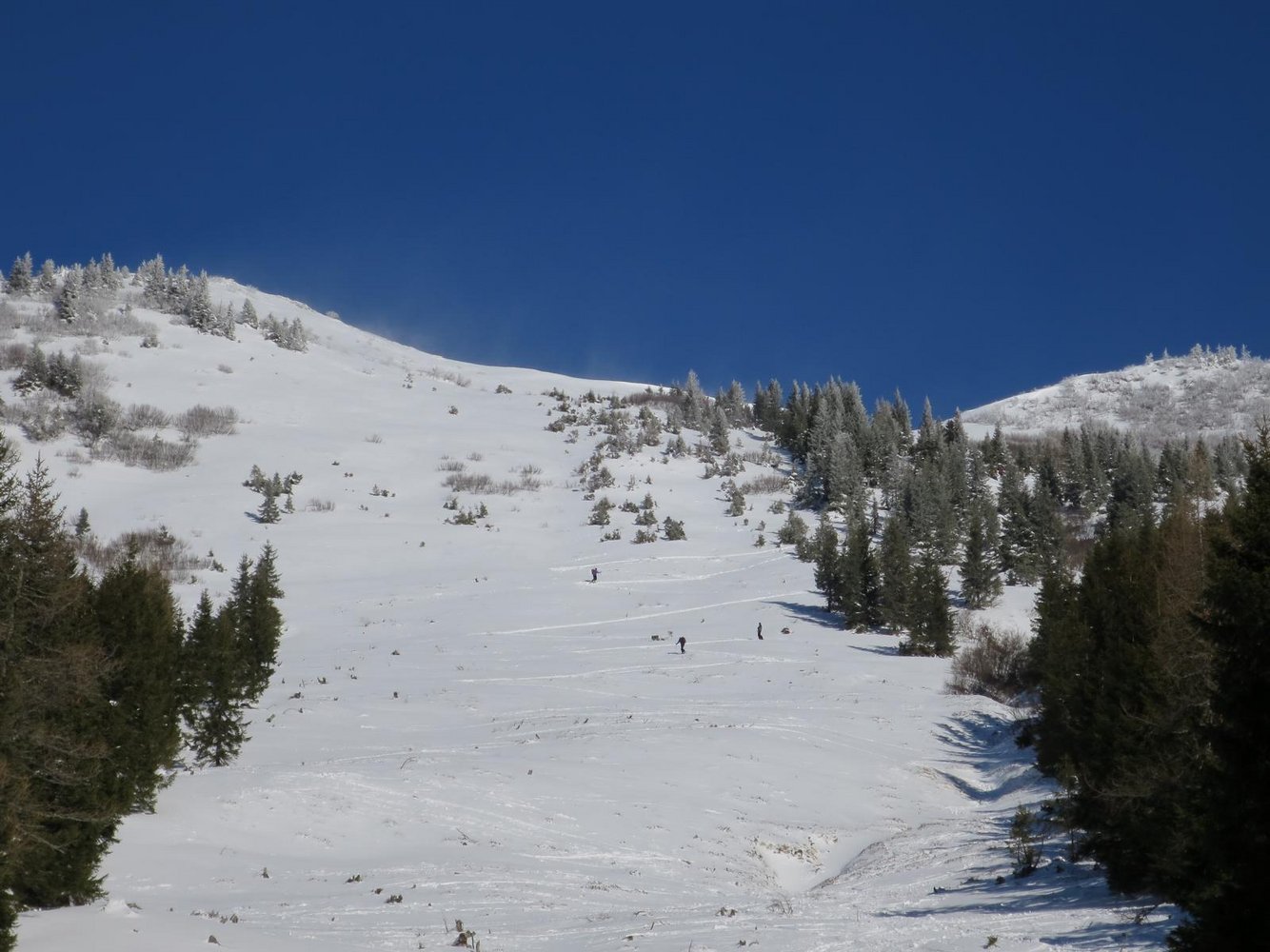 Abfahrt: Vom Gipfel entlang der Aufstiegsspur zum See und dann links durch lichten Wald hinunter. Am Ende der freien Fläche rechts in den flachen Rinnenauslauf queren. Nach einem kurzem Steilhang. Hier links zurück zur Aufstiegsspur.