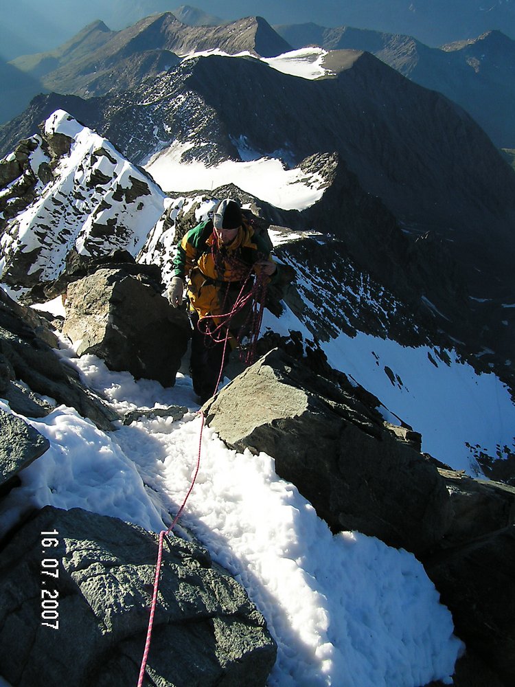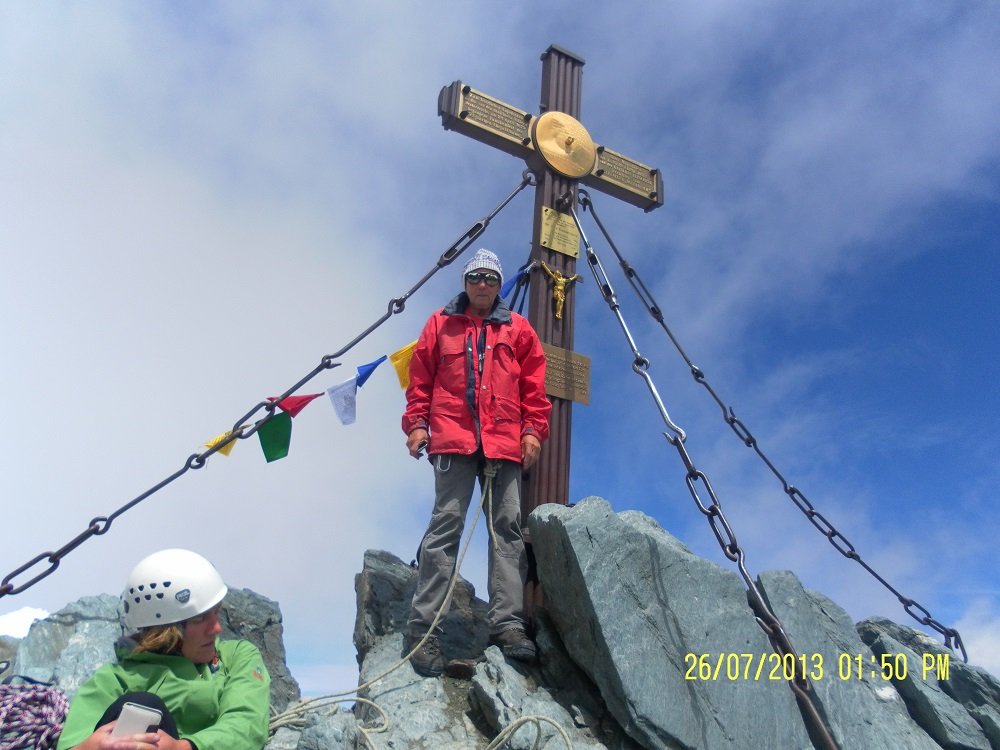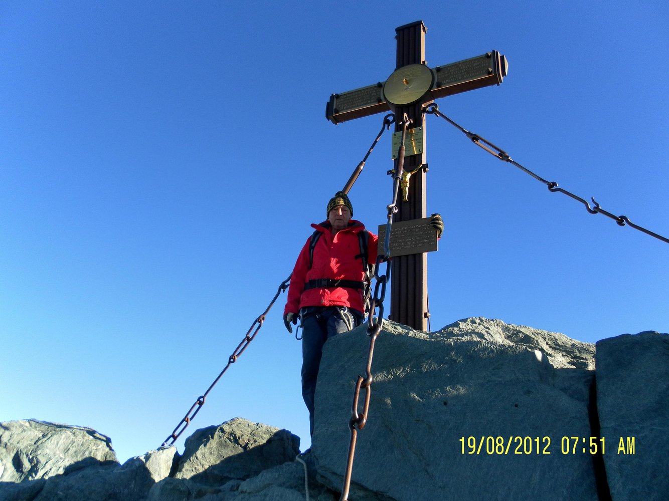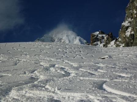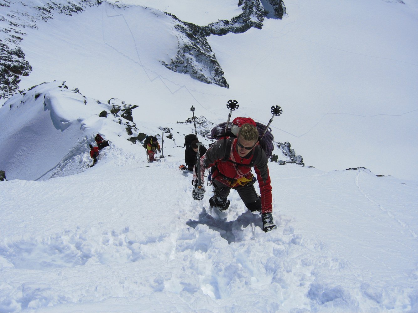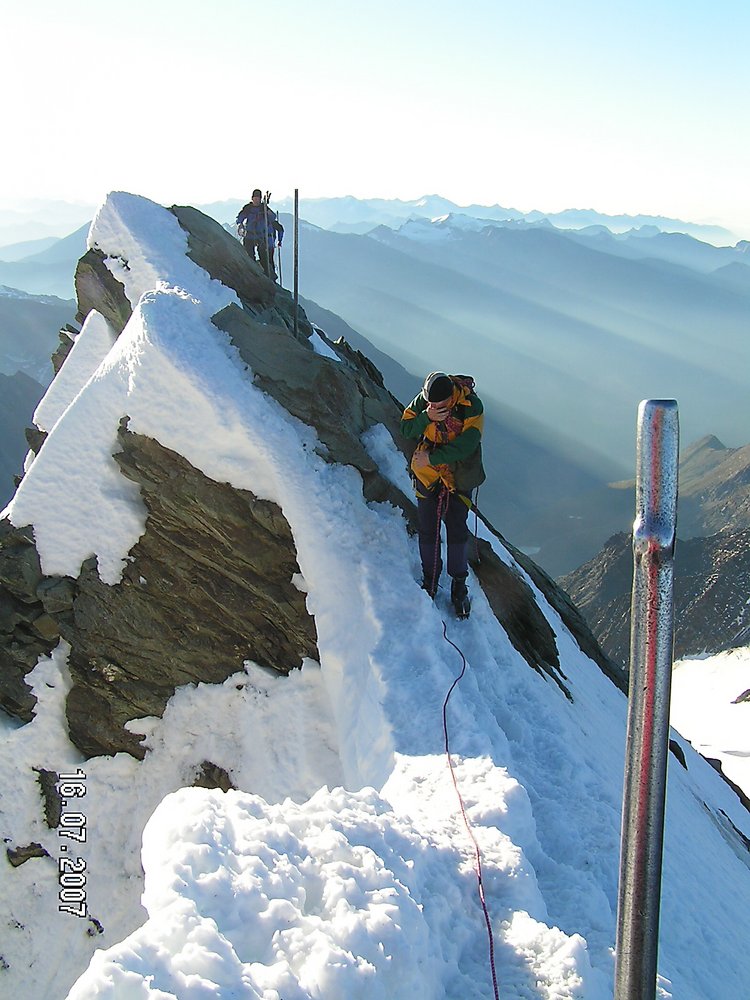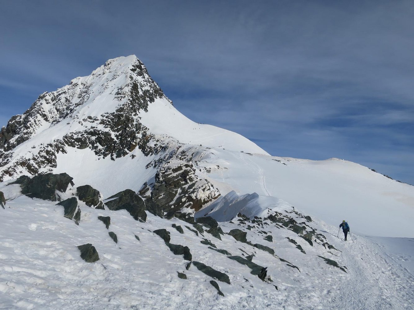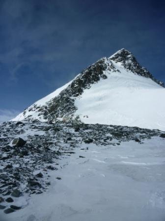 Hier gibt es zwei Möglichkeiten, entweder über den mit Drahtseilen versicherten Blockgrat, oder - nur bei wirklich sehr guten Bedingungen - mit Schiern (dann macht man das Skidepot beim Glocknerleitl) oder Steigeisen über die sehr steile S-Flanke (Spalten!) direkt hinauf in Richtung Glocknerleitl. Weiter nordwestwärts in Richtung Gipfel und über das steile Glocknerleitl bis unter die Felsen des Kleinglockners - höchstmögliches Skidepot 2 auf 3680 m, bei viel Betrieb bereits 70 Hm tiefer auf einem breiten Schneeabsatz (Skidepot 1). Weiter mit Steigeisen, Pickel und Seil, entweder über - mit dicken Seilen versicherten - kurzen Felsrücken und einer Schneerinne hinauf zum Grat und diesem zum Gipfel des Kleinglockners folgen. Vom Kleinglockner über die ausgesetzte Scharte zum letzten kurzen Aufschwung vor dem Hauptgipfel. Die letzten Meter steil - tlw. leichte Kletterei - bis zum höchsten Punkt (der Grat ist mit Eisenstangen markiert bzw. sind teilweise Drahtseile vorhanden - bei Schneelage und Vereisung aber sehr ernst!)