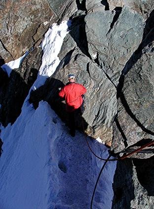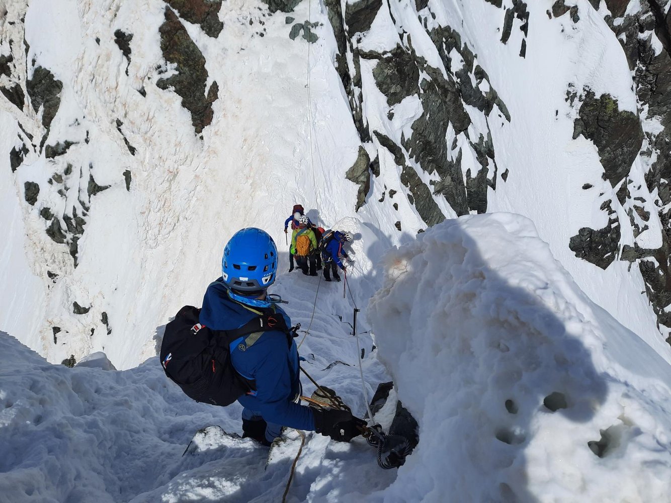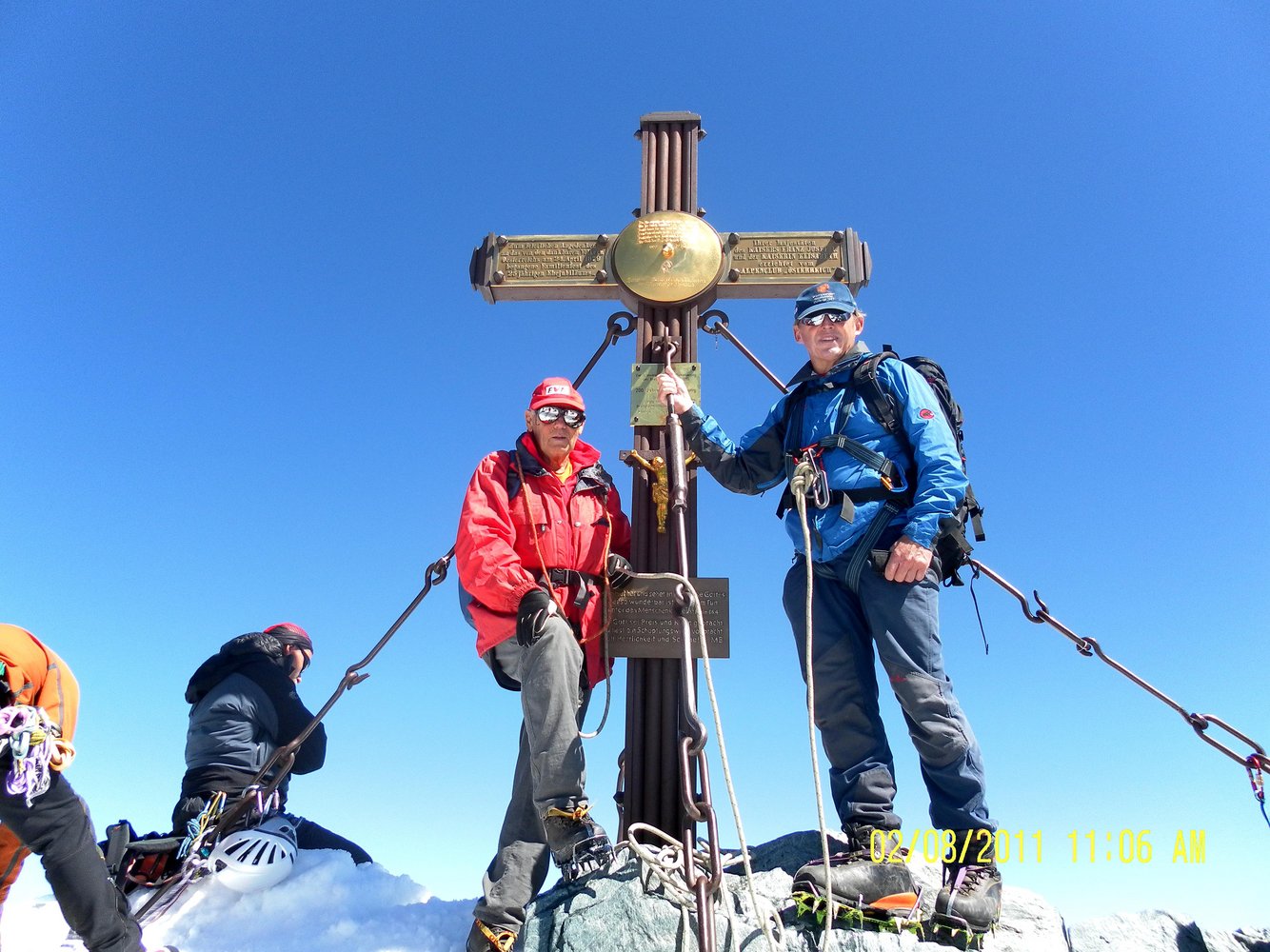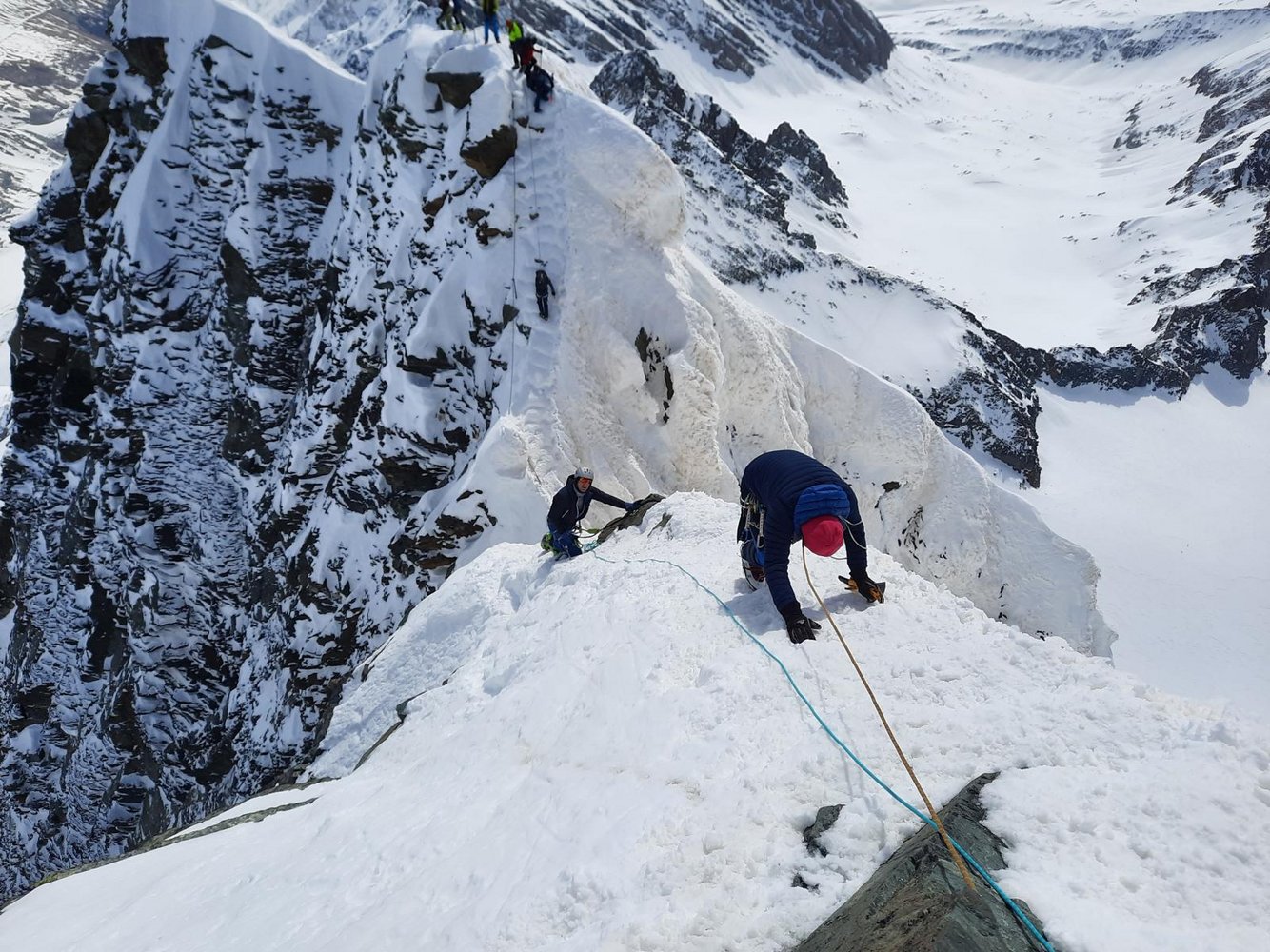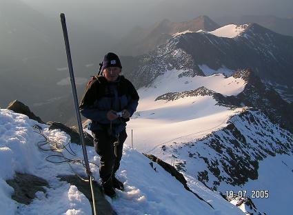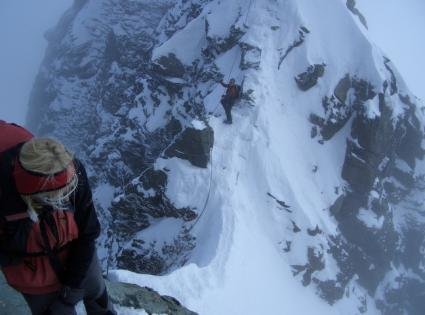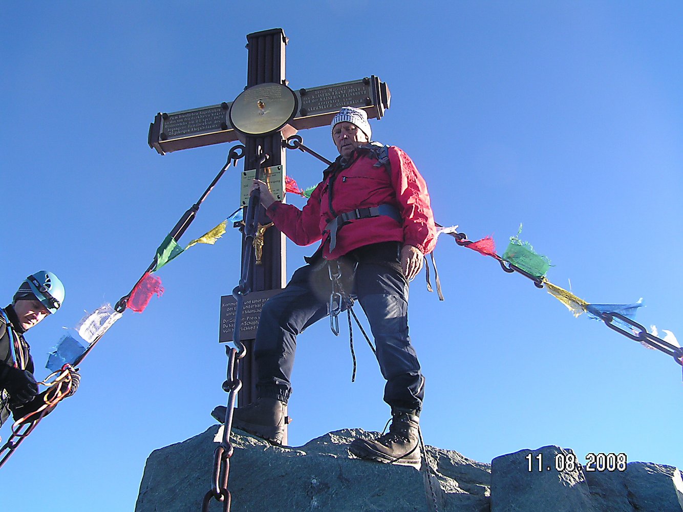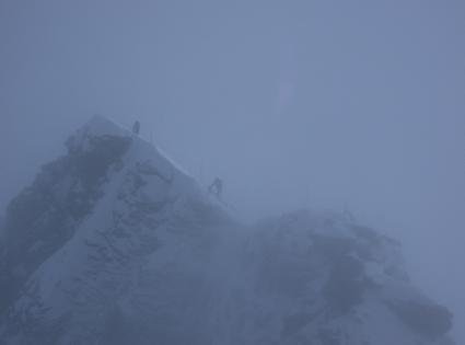 Hier gibt es zwei Möglichkeiten, entweder über den mit Drahtseilen versicherten Blockgrat, oder - nur bei wirklich sehr guten Bedingungen - mit Schiern (dann macht man das Skidepot beim Glocknerleitl) oder Steigeisen über die sehr steile S-Flanke (Spalten!) direkt hinauf in Richtung Glocknerleitl. Weiter nordwestwärts in Richtung Gipfel und über das steile Glocknerleitl bis unter die Felsen des Kleinglockners - höchstmögliches Skidepot 2 auf 3680 m, bei viel Betrieb bereits 70 Hm tiefer auf einem breiten Schneeabsatz (Skidepot 1). Weiter mit Steigeisen, Pickel und Seil, entweder über - mit dicken Seilen versicherten - kurzen Felsrücken und einer Schneerinne hinauf zum Grat und diesem zum Gipfel des Kleinglockners folgen. Vom Kleinglockner über die ausgesetzte Scharte zum letzten kurzen Aufschwung vor dem Hauptgipfel. Die letzten Meter steil - tlw. leichte Kletterei - bis zum höchsten Punkt (der Grat ist mit Eisenstangen markiert bzw. sind teilweise Drahtseile vorhanden - bei Schneelage und Vereisung aber sehr ernst!)