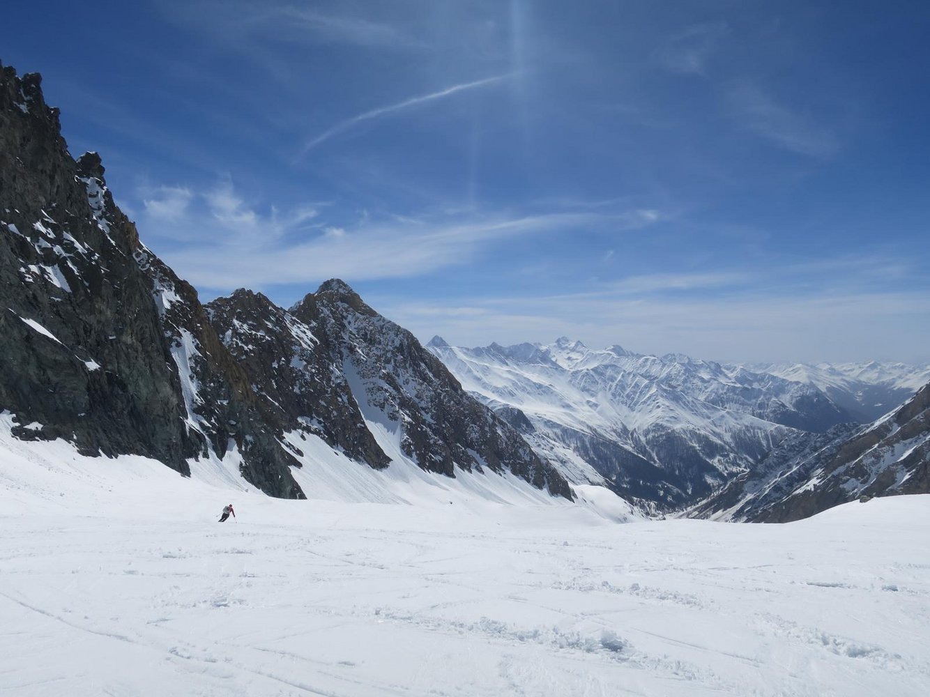 Abfahrt wie Aufstieg. Man kann bei guter Schneelage direkt - vorbei an der Langen Wand - in Richtung Lucknerhütte abfahren (siehe GPS Track und Übersichtsbild). Die direkte Abfahrt vom Glocknerleitl zum Ködnitzkees ist sehr steil und sollte nur nach vorangegangenem Aufstieg gemacht werden!