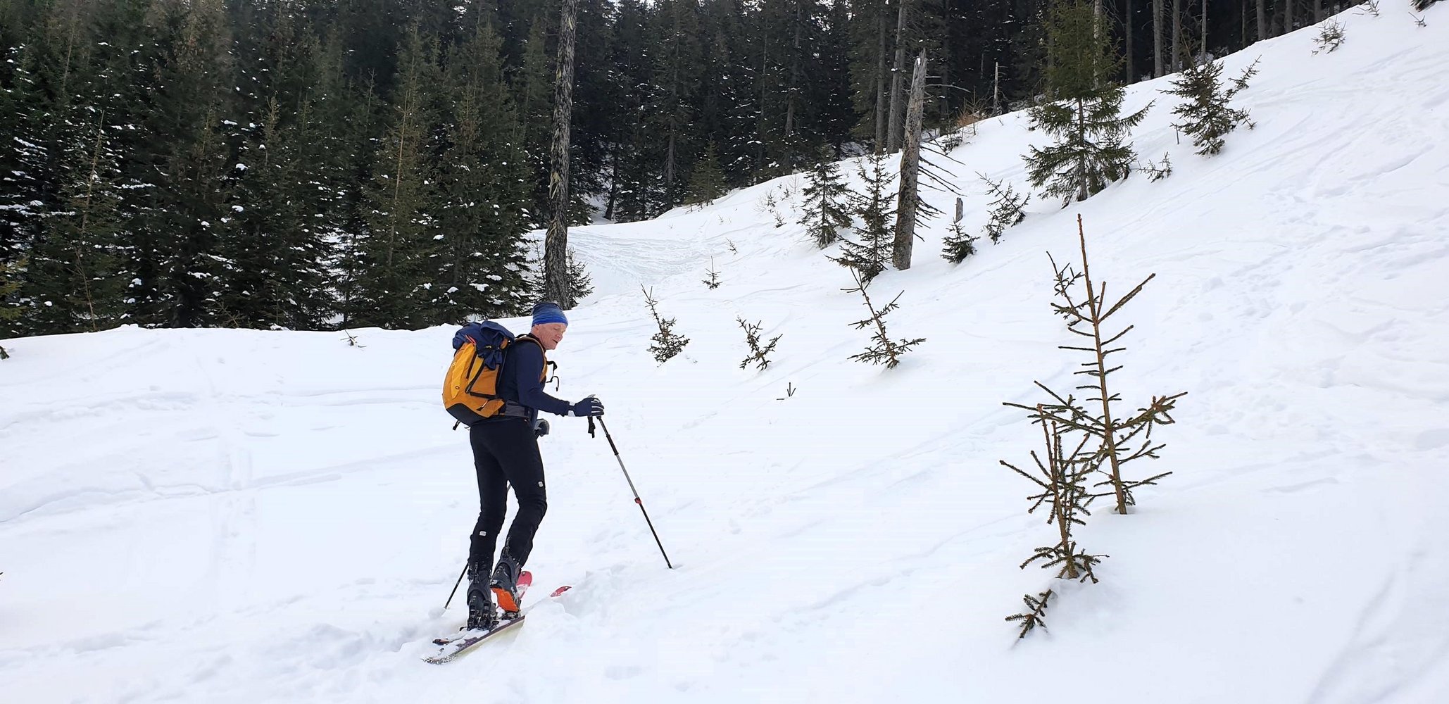 Abfahrt: Vom Gipfel vielleicht 100 Meter am Grat zurück und gleich über den ersten Hang zur Forststraße (ACHTUNG: Über der Forstraße ist stellenweise eine 5 m hohe senkrechte Böschung, die man gut umfahren kann). Auf der Straße 50 m nach links und die nächste Rinne hinunter bis man wieder vor der Grössinger Alm zur Aufstiegsspur gelangt.
