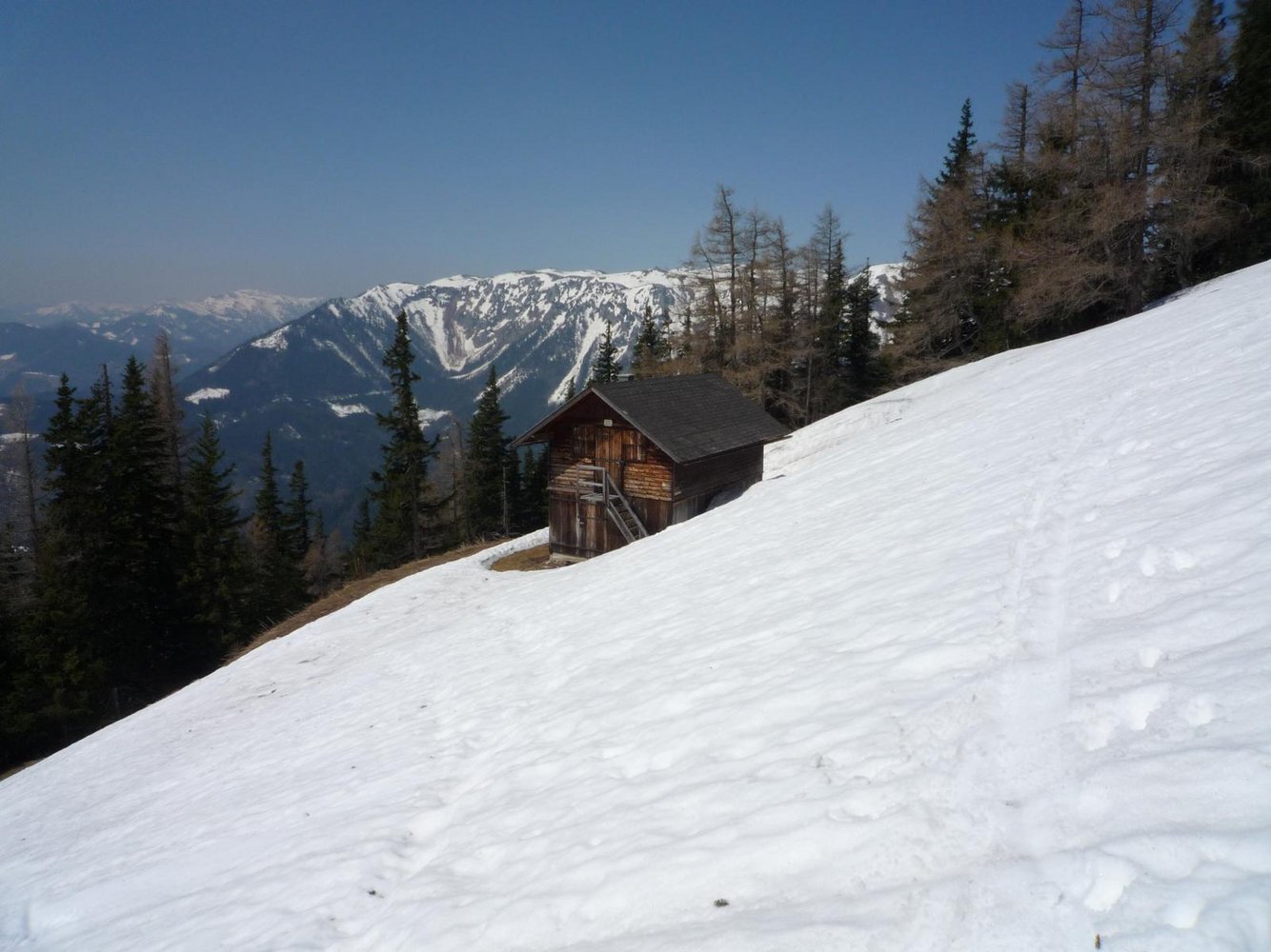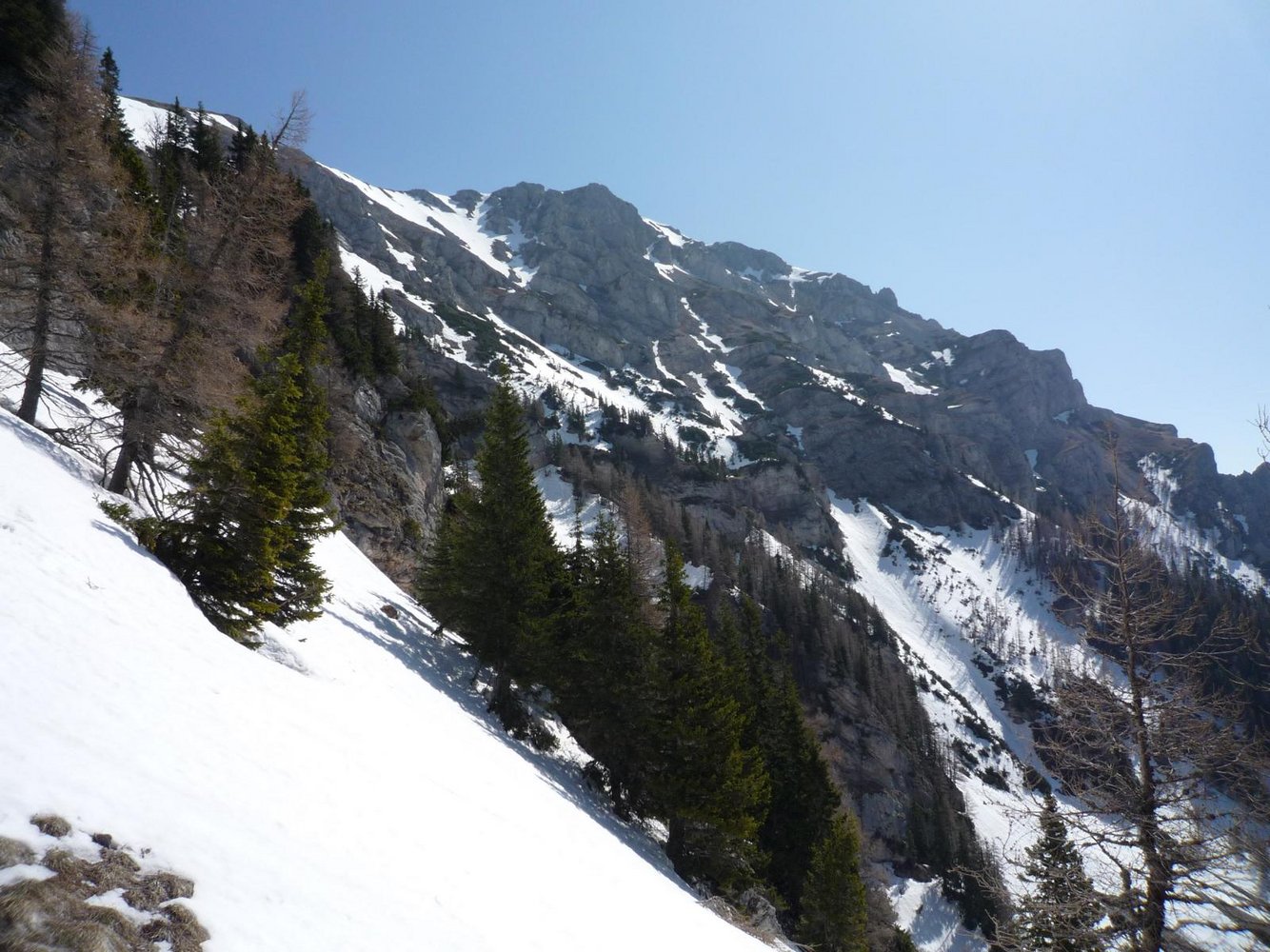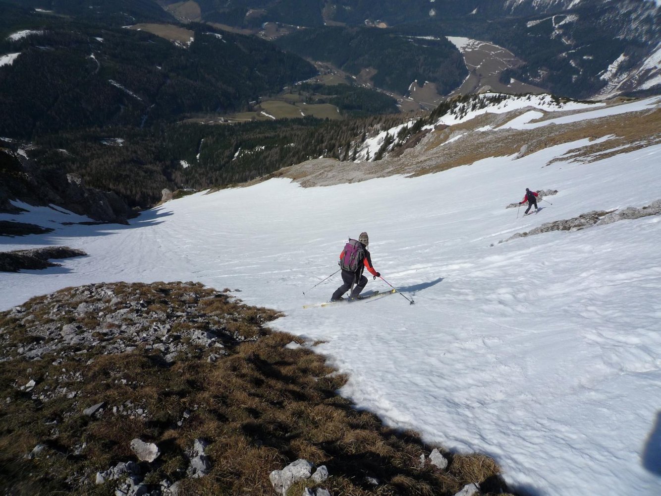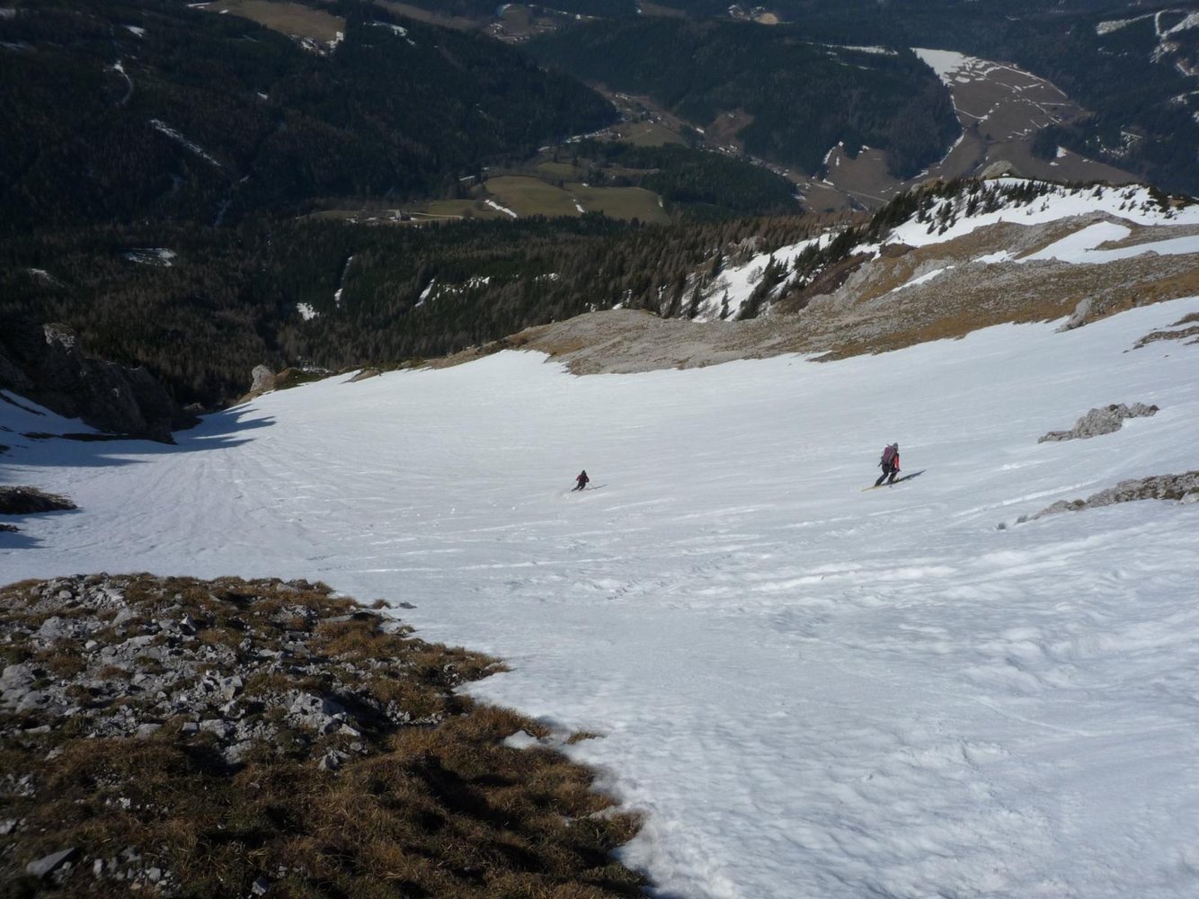 Abfahrt: Der anfangs flachen Rinne hinunter zur Engstelle folgen. Durch sie hindurch und weiter zwischen Latschen hinunter zur Karrenalm und weiter über den Aufstiegsweg retour.