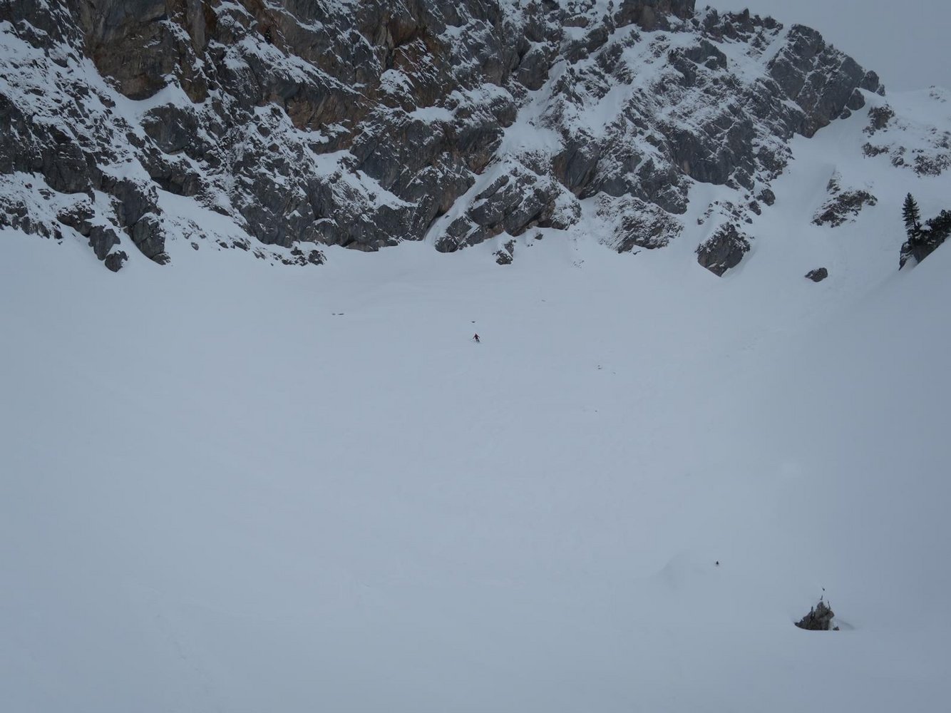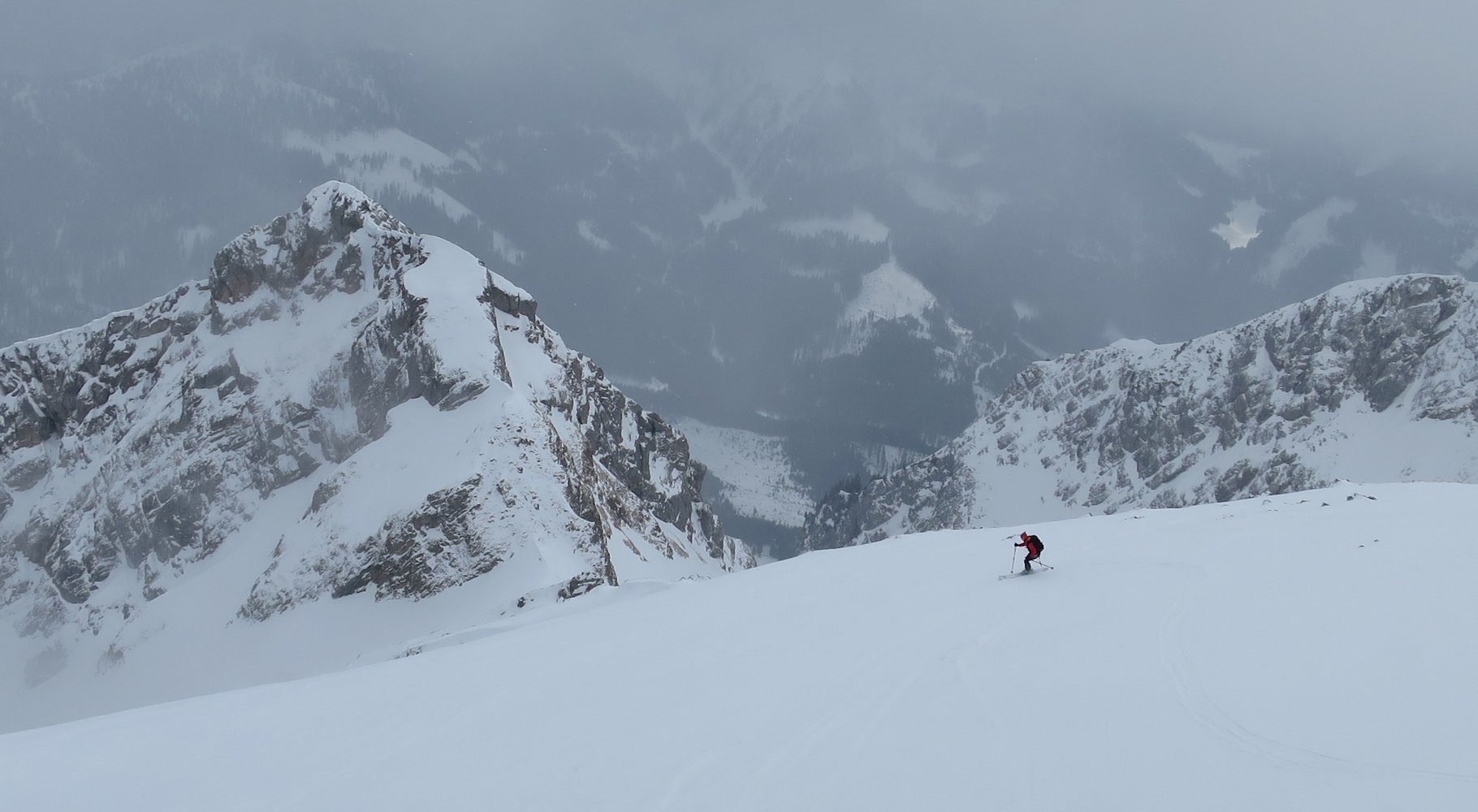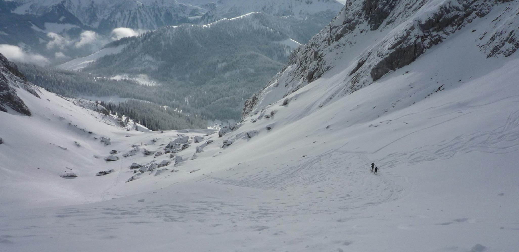Bei schlechter Sicht im Gipfelbereich ist die Einfahrt ins Gsuchkar nicht zu empfehlen, da es vom Gipfel zwischen Felsstufen steil hinunter geht!