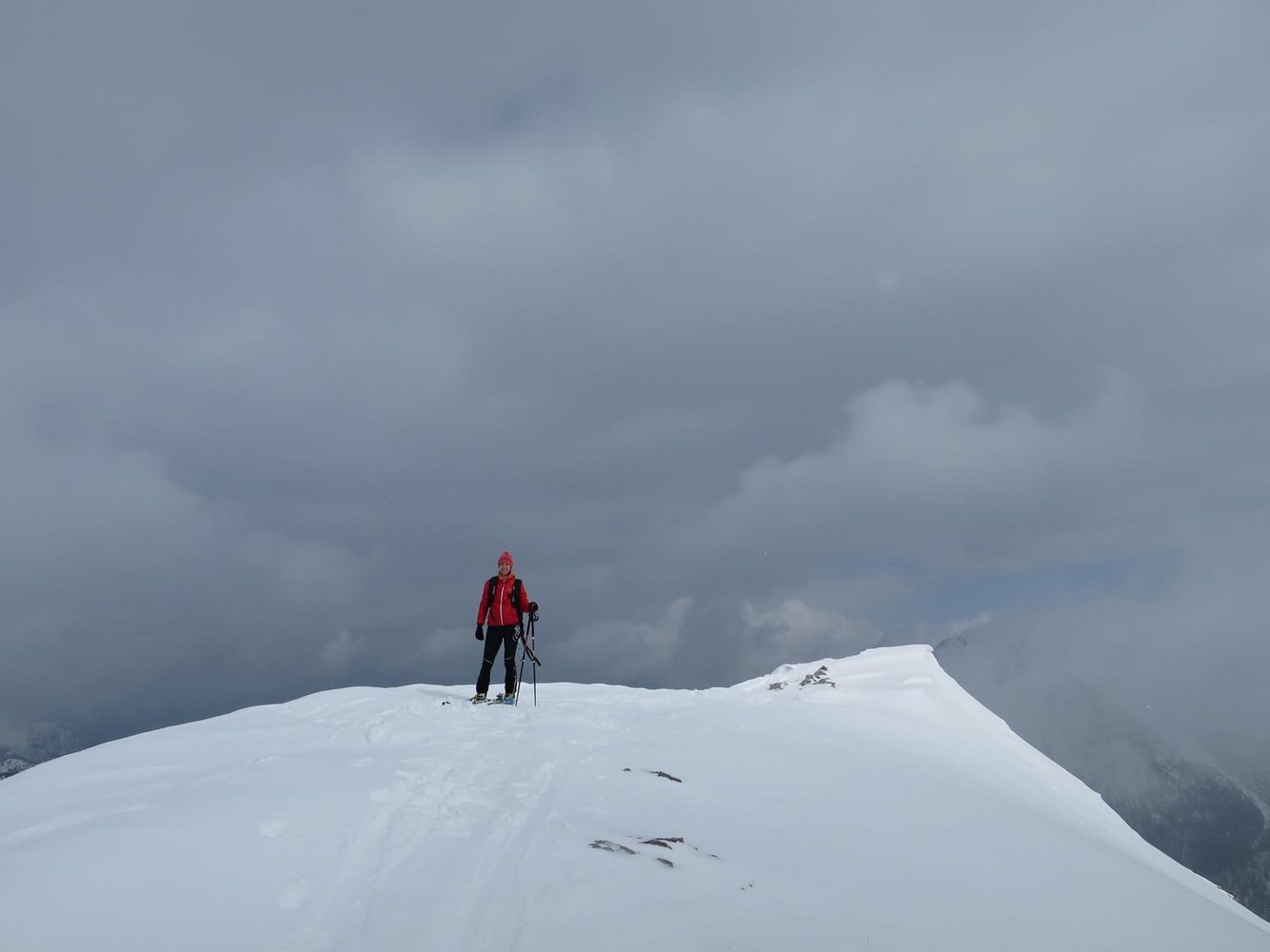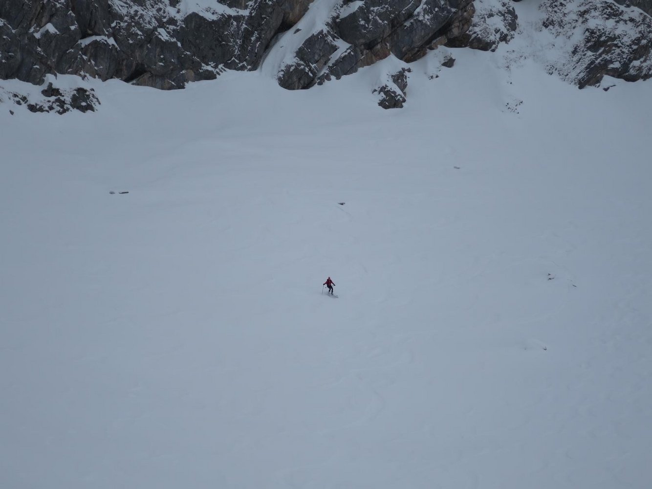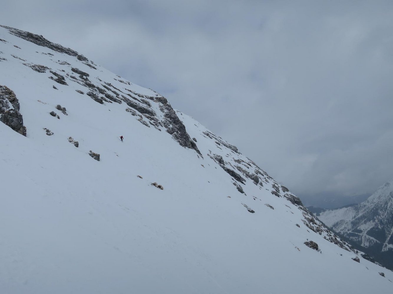 Bei schlechter Sicht im Gipfelbereich ist die Einfahrt ins Gsuchkar nicht zu empfehlen, da es vom Gipfel zwischen Felsstufen steil hinunter geht!