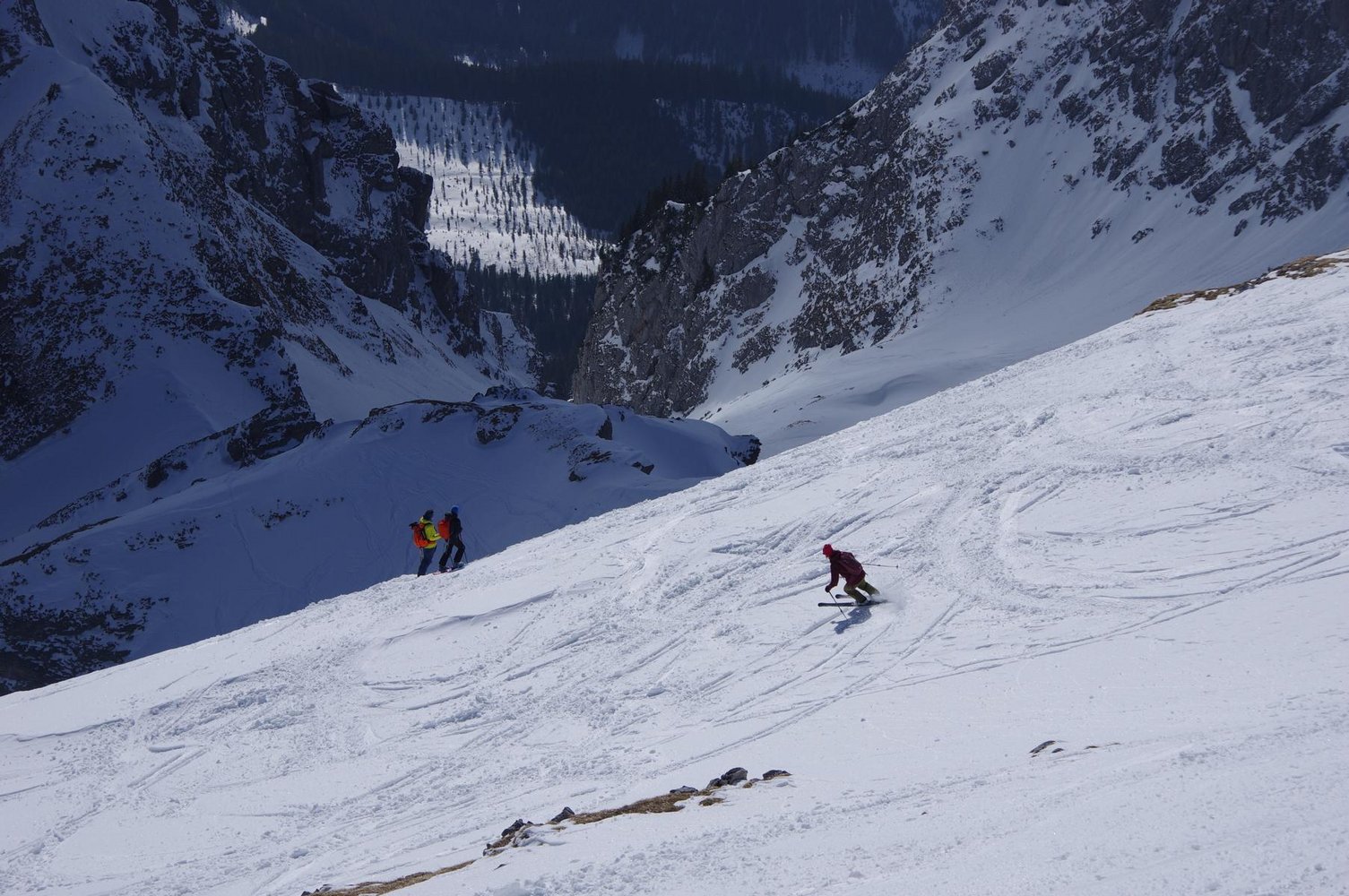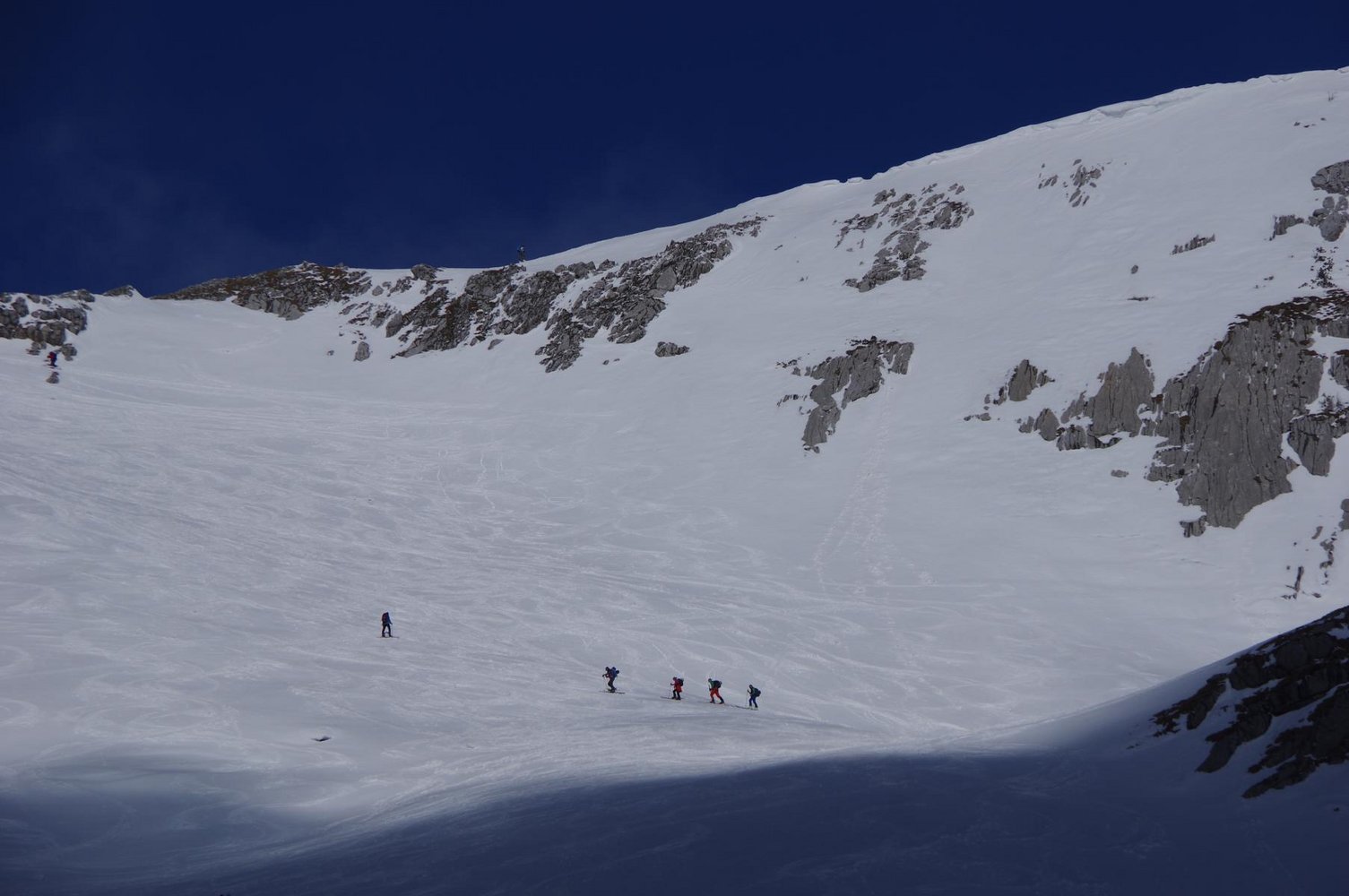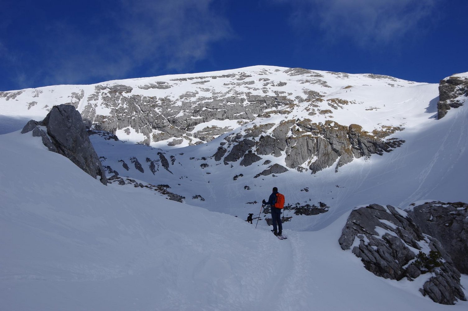 Abfahrt wie Aufstieg: Mann kann vom Gipfel bei sicheren Verhälnissen auch direkt in den gr. Kessel des Südkars abfahren.