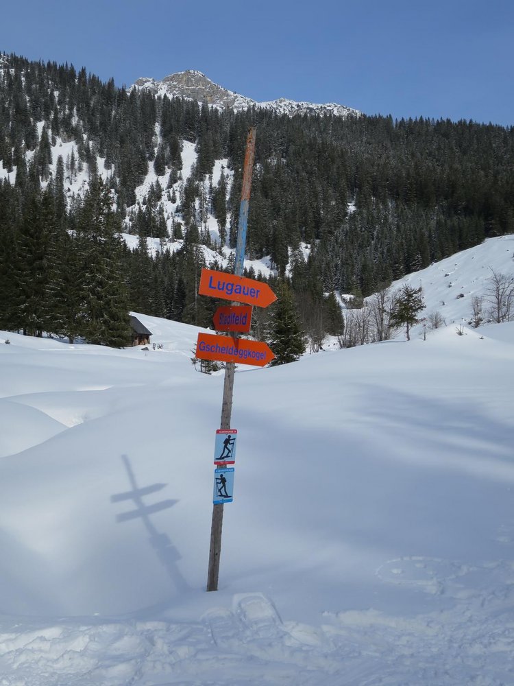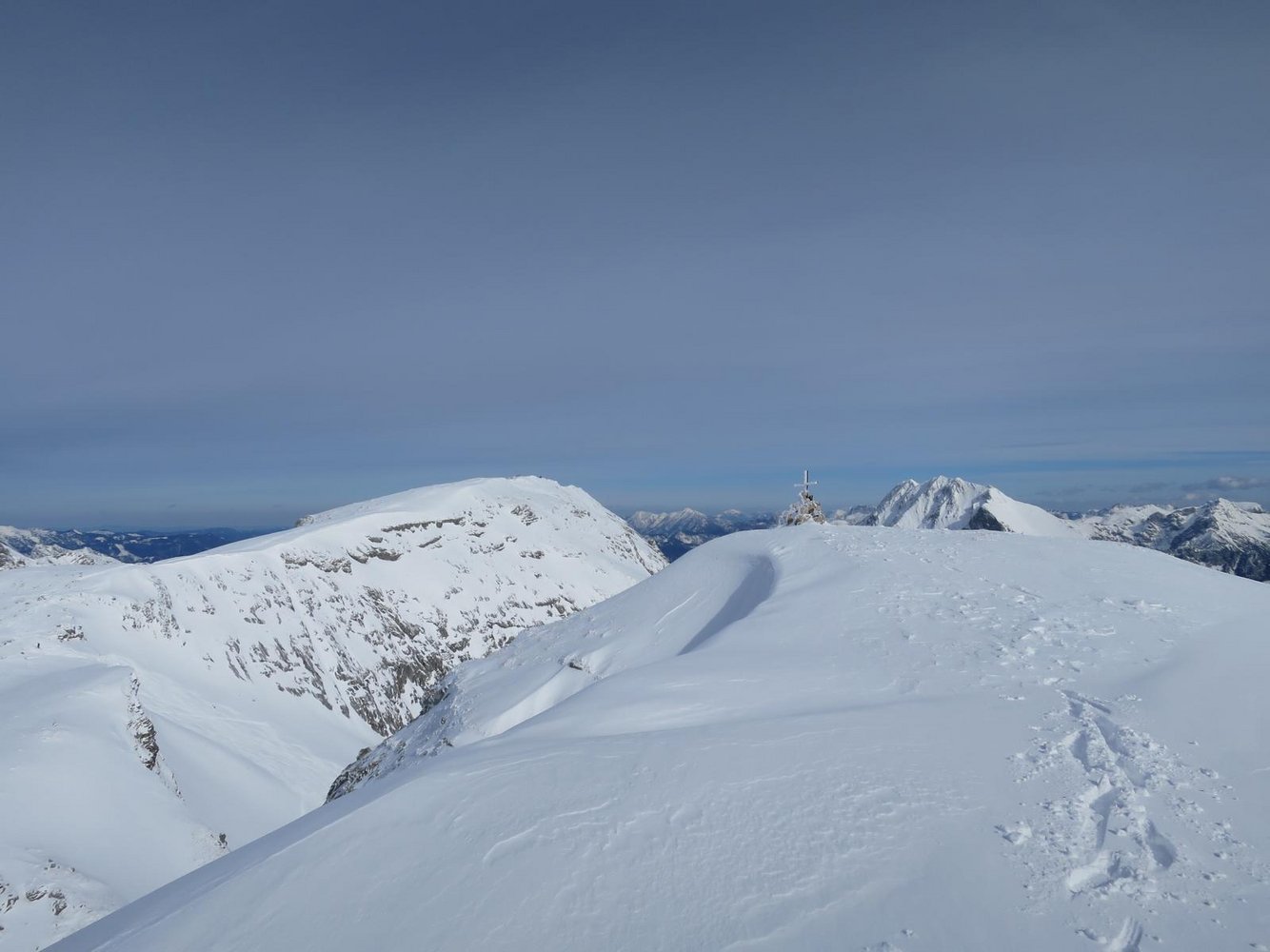 Der Aufstieg beginnt beim Bauernhof "Ebner" und führ auf einer Forststraße (2 kl. Tunnel) Richtung Ebneralm. Nach der langen geraden noch ein Stück auf der Straße Richtung Ebneralm, dann links (Skitourenmarkierung) in einem Schlag abkürzen und hinauf zur Forststraße vor der Pfarralm. Mann bei der Skitourenmarkierung auf der Forststraße links (oft gesport) über eine bewaldete Rinne und später Wiese zu einer Forststraße aufstiegen und dieser rechts ins Südkar folgen oder man geht zur Pfarralm und bei der Skitourenmarkierung links hinauf ins Südkar. Das steiler werdende Kar hinauf bis zu einem großen Kessel unter dem Gipfel. Hier hält man sich leicht links zum Gipfelgrat und folgt dem flachen Grat nach rechts (Osten) zum höchsten Punkt. Vom Gipfelgrat erreicht man auch in 20 min. links zum Stadelfeldschneid ausfstiegen. Die letzten Meter zu Fuß.