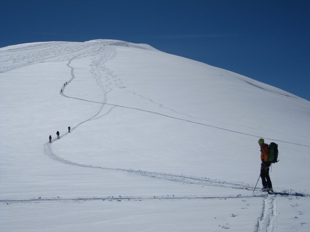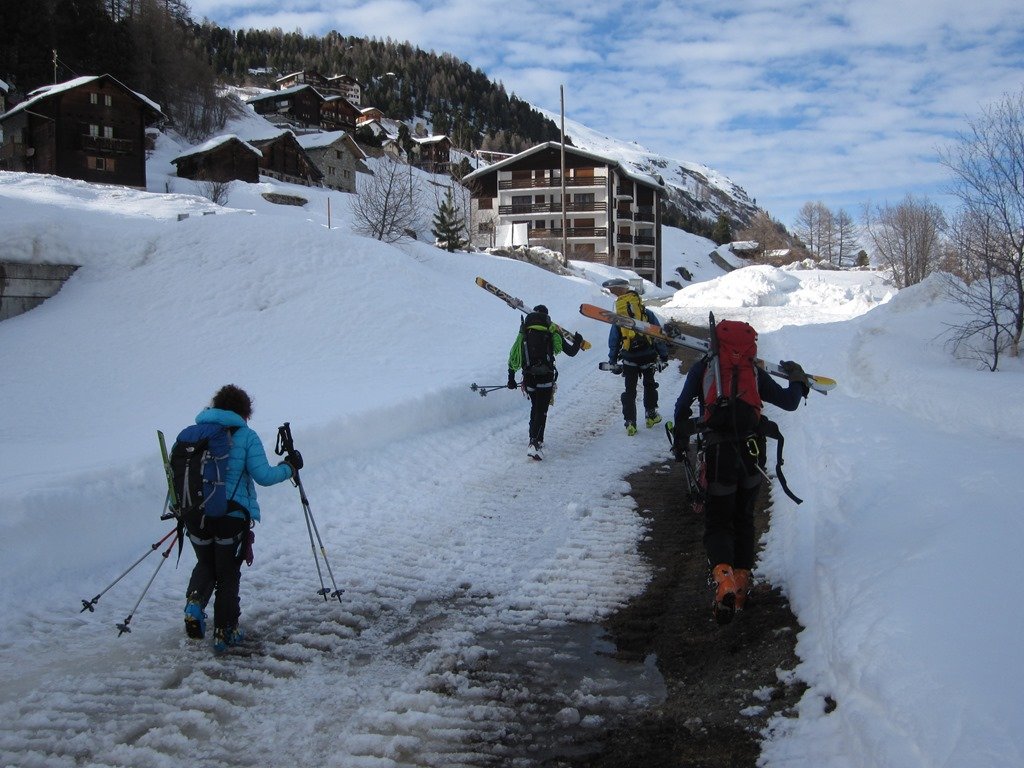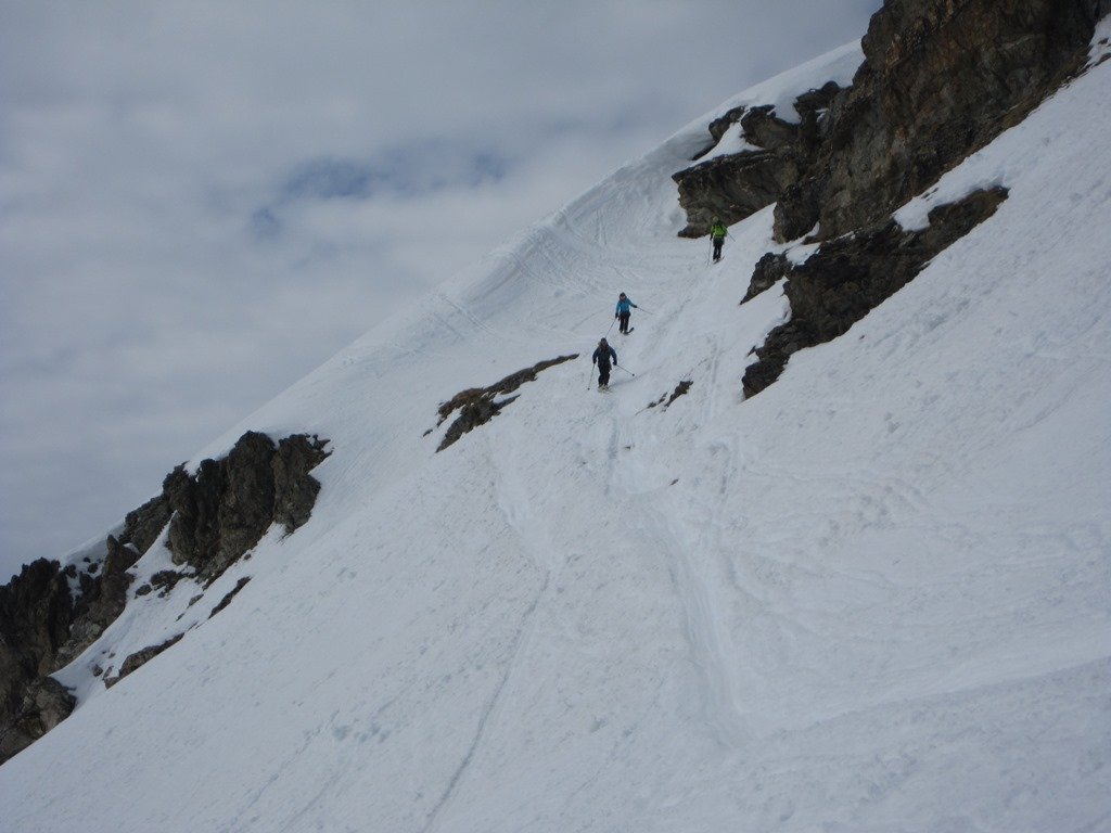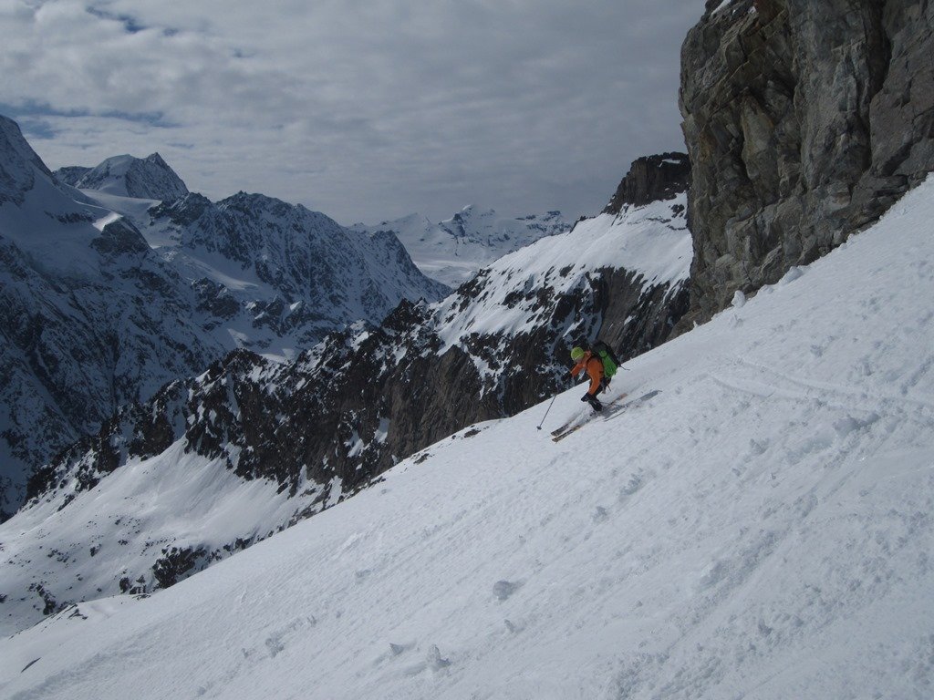 Von der Schönbielhütte kurz aufsteigen und über die steile Seitenmoräne bis auf ca. 2200 m auf den Zmuttgletscher abfahren. Dort anfellen und am Zmuttgletscher zum Tiefmattengletscher aufsteigen. Die Seracs des Tiefmattengletschers s-förmig rechts umgehen und in einen flachen Gletscherboden unterhalb des Stockjigletschers aufsteigen (ca. 3000 m). Dort scharf rechts, um über eine etwas steilere Flanke den Stockjigletscher zu erreichen. In einem weiten Linksbogen über den spaltenreichen Gletscher ins Col de Valpelline. Bei guten Verhältnissen bietet sich die Besteigung der Tête de Valpelline (3799 m, 250 Hm zusätzlich) an. Vom Col de Valpelline scharf rechts in Kürze ins Col de la Tête Blanche (3589 m) aufsteigen und in östlicher Richtung auf einen flachen Sattel. Dort bietet sich die Besteigung der Tête Blanche (3710 m, 50 Hm zusätzlich) an. Es folgt die Abfahrt am linken Rand des Glacier du Mont Miné in nordwestlicher Richtung. Am Fuß des Dents de Bertol fellt man wieder auf und quert leicht ansteigend und links haltend in das Col de Bertol (3268 m). Mit einer Nächtigung in der Cabane de Bertol kann die Etappe dort geteilt werden. Vom Col de Bertol über die Reste des Glacier de Bertol in südwestlicher Richtung auf die Plans de Bertol (Punkt 2664) abfahren. Achtung: Nicht in die Schlucht des Torrent de Bertol einfahren! Diese ist Steilrinnenexperten bei sehr sicheren Verhältnissen vorbehalten. Vom Punkt 2664 in südlicher Richtung und dann in einem großen Rechtsbogen auf die Zunge des Bas Glacier d' Arolla abfahren. Dann immer flacher werdend dem Tal in nördlicher Richtung bis Arolla folgen. Das Ortszentrum befindet sich etwa 50 Hm oberhalb des Endes der Abfahrt und kann nach 1 km Fußmarsch oder mit dem (für Schweizer Verhältnisse) selten verkehrenden Linienbus erreicht werden.