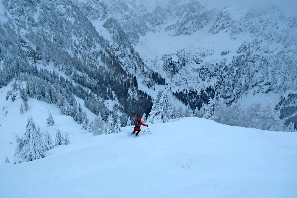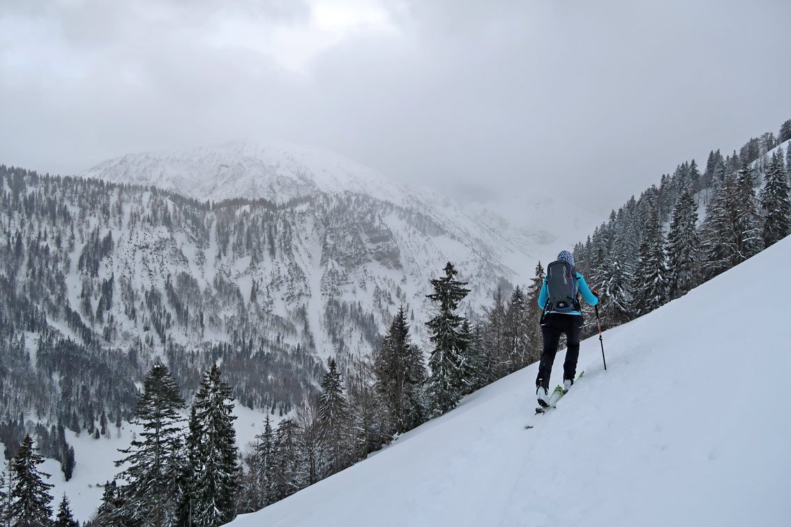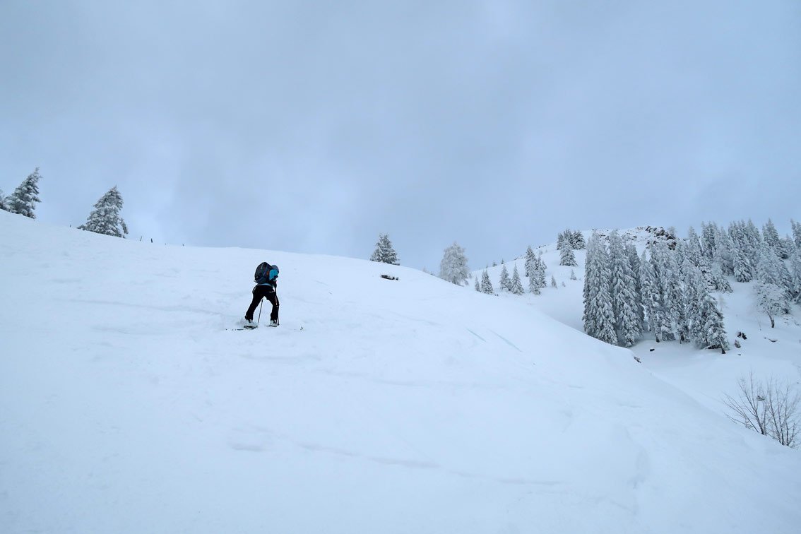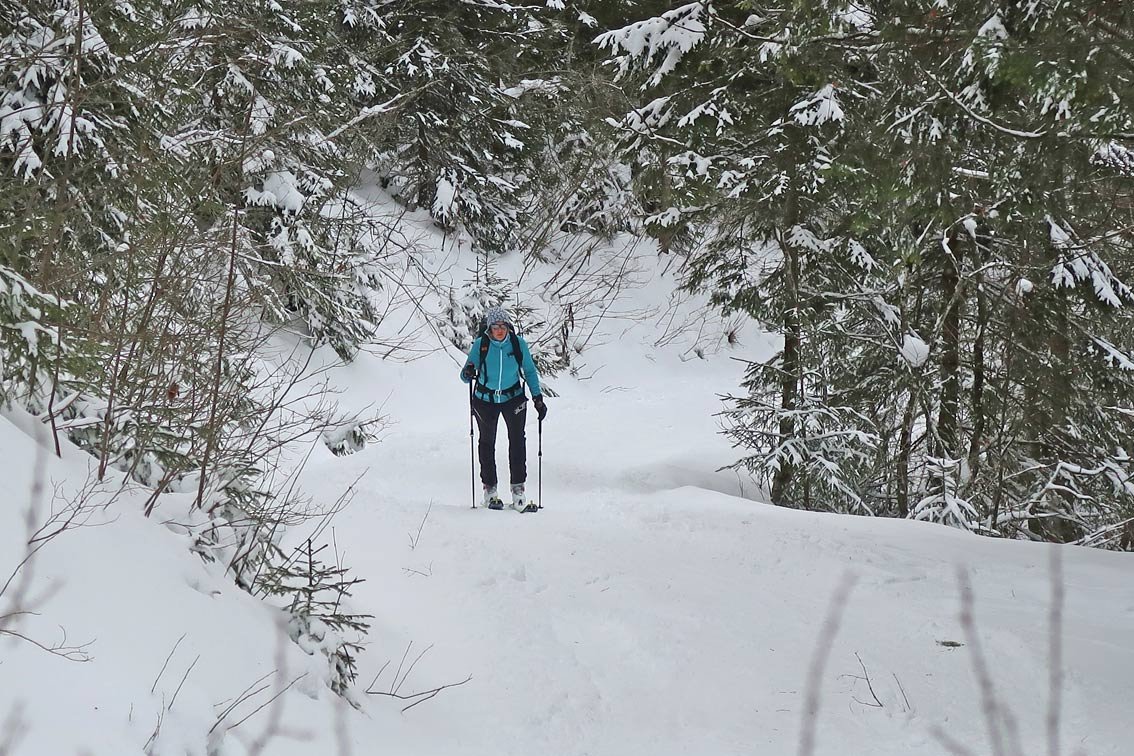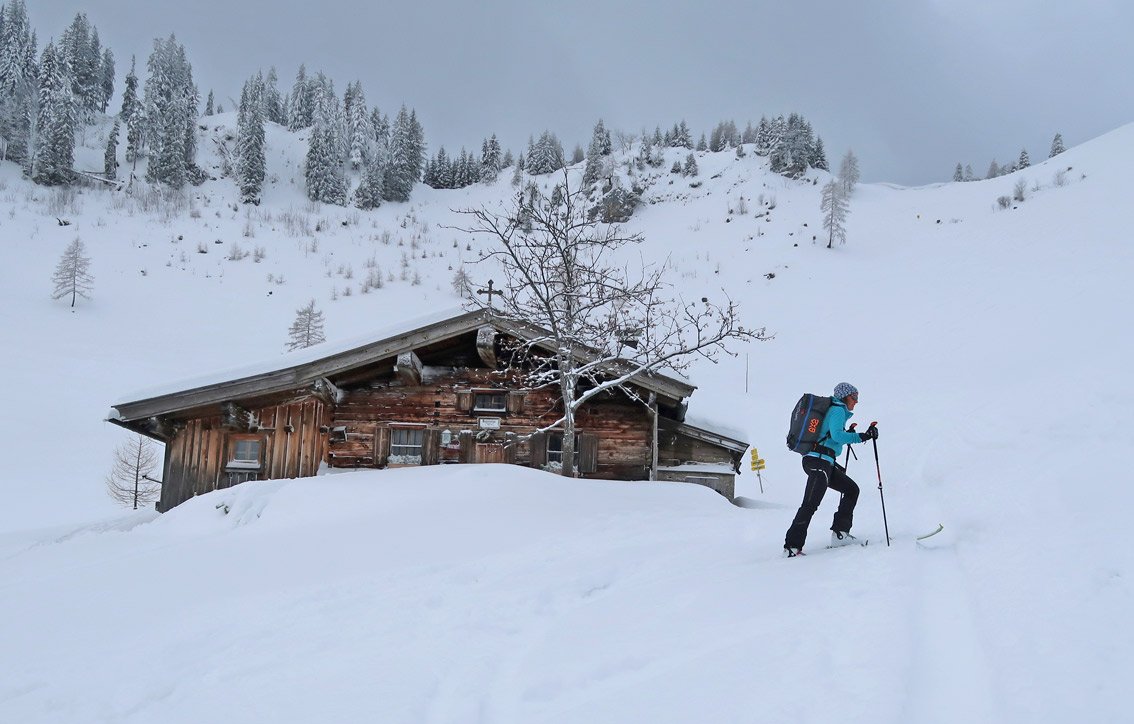 Einzig auf dem Hang vor der Hageralm und nach der Alm hinauf zum Joch ist es etwas steiler (lawinengefährlich).