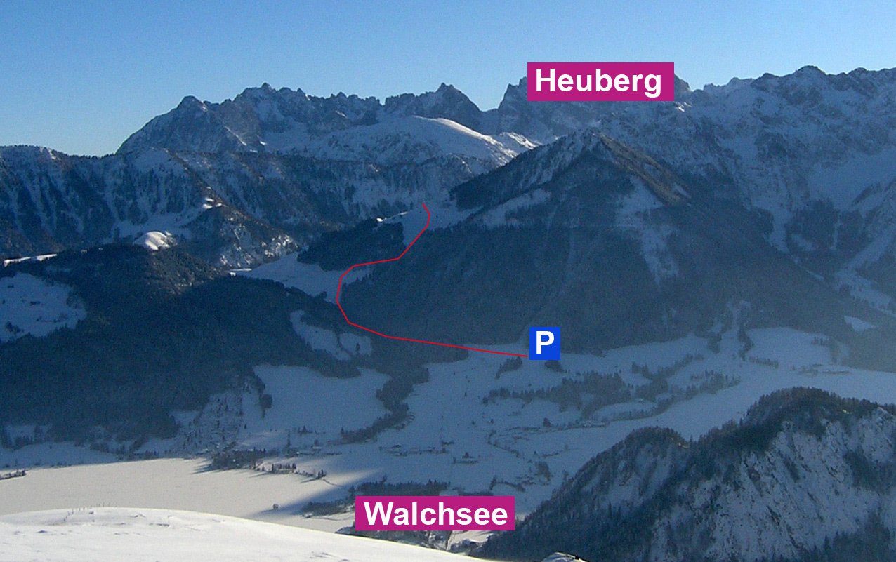 Über die Autobahn bis nach Oberaudorf und dort weiter bis nach Walchsee - im Ort gleich nach der Ortstafel (Spargeschäft) rechts ab bis zum Parkplatz "Heuberg" - dort parken. Öffis: Mit dem Bus nach Walchsee und weiter zu Fuß zum Beginn der Tour.
