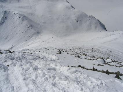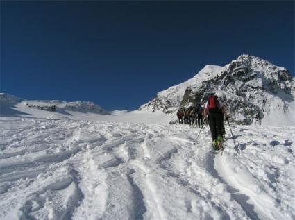 Vom Parkplatz bei der Gletscherbahn folgt man hinten der Skipiste (rechts in Richtung Gamsgarten) bis diese vor dem Vorderen Daunkopf nach links führt - hier rechts in die Glamergrube aufsteigen und von dieser links unter dem Gipfel vorbei auf den Daunkopfferner. Über den Ferner bis zu einer Scharte und von dieser unter den Felsen bis zum Daunjoch queren. Nun je nach Möglichkeit mit Ski oder meist zu Fuß den meist abgeblasenen Rücken aufsteigen, oben flach bis zum höchsten Punkt mit Kreuz.