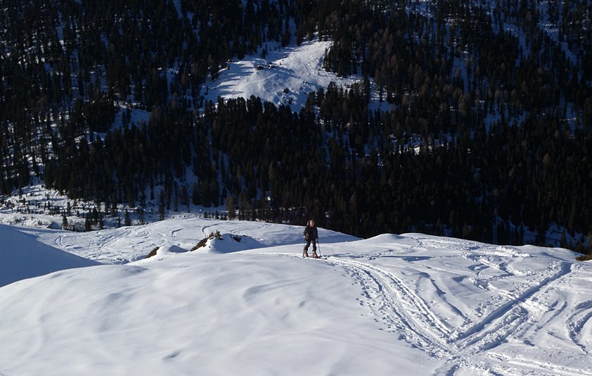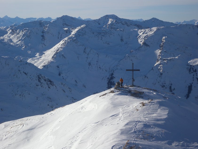 Die Hippoldspitze ist ein Nachbargipfel der Krovenzspitze, wird aber seltener bestiegen. Bis auf den kurzen, etwas steileren Gipfelhang eine technisch leichte Skitour. Oben steht ein schönes Gipfelkreuz auf einer flachen Kuppe, der eigentiche Gipfel ist auf einem Felsblock dahinter (zu Fuß zu besteigen).
