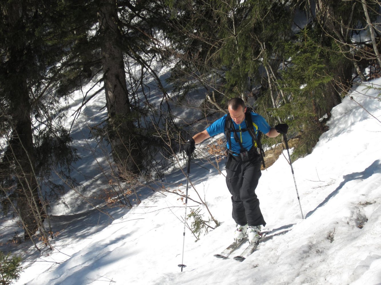 Abfahrt wie Aufstieg. Bei guten Bedingungen kann man den Rücken in südöstlicher Richtung abfahren bis zum Beginn der Torauschneid. Hier geht es südwestlich (rechts) den Sommerweg hinab. Das Gelände hier ist sehr steil und der Weg sehr schmal und ausgesetzt. Weiter über schöne Hänge hinunter zu den Torau Almen und entlang der Forststraße das Tal hinaus und runter bis zum Auto.