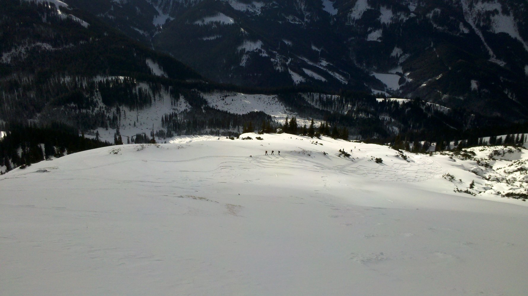 Abfahrt: Wie Aufstieg. Im Wald kann man links durch eine steile Rinne in das Kar, welches zur Neuburgalm hinunterreicht, abfahren und vorbei an der Alm zurück zur Pfarralm.