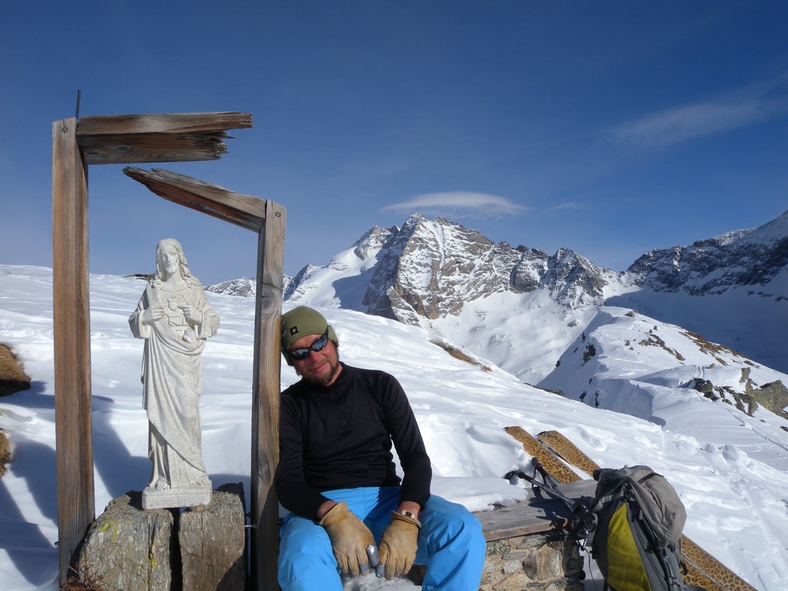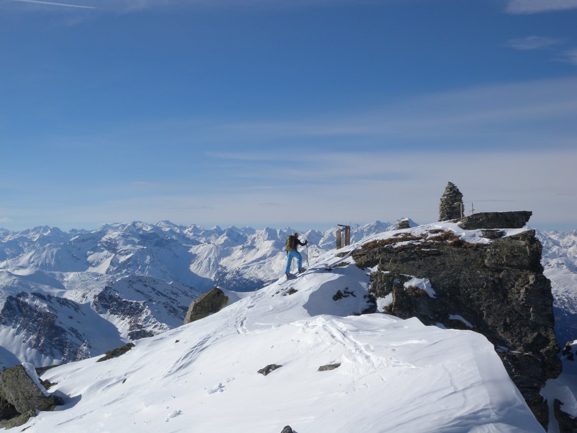 Schöne Skitour auf die Hohe Kirche im Valsertal, tolle Aussicht vom Gipfel auf Olperer, Fußstein, Schrammacher und die Stubaier Alpen. Die Skitour gehört zu den eher unbekannten Zielen in den Zillertaler Alpen und hat einen schön gestalteten Gipfelbreich (Christusstatue, Steinmänner und kleine Kreuze).