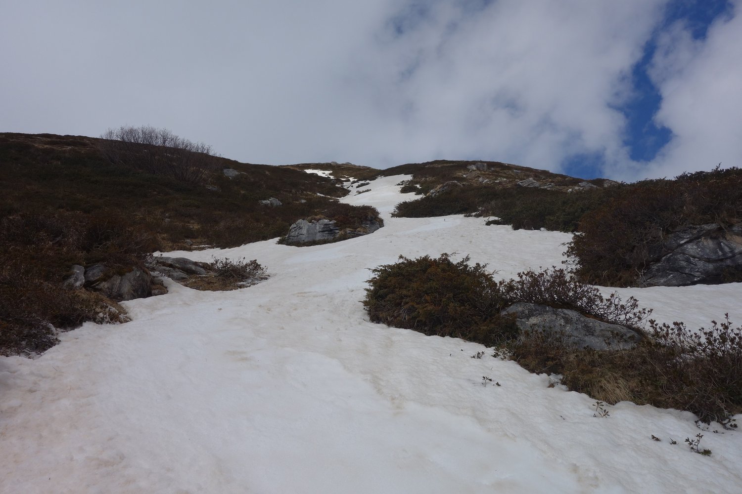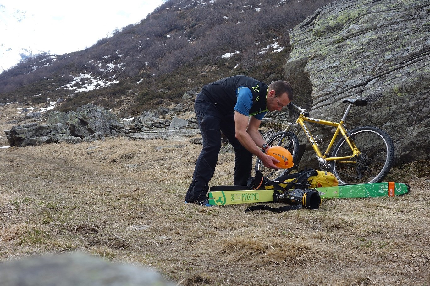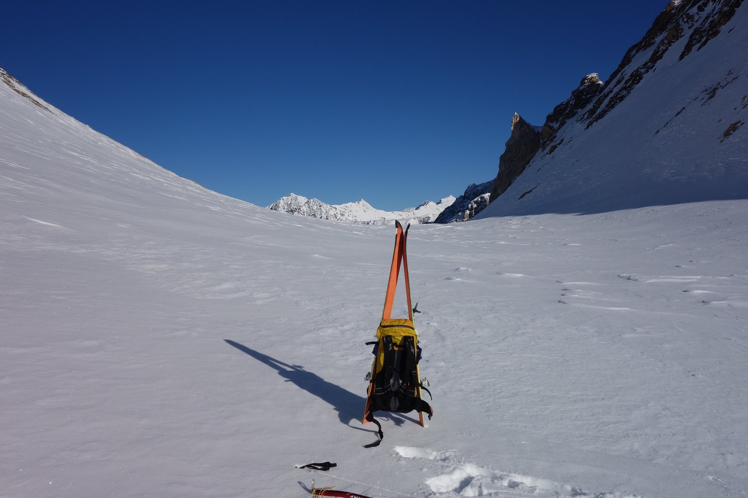 Abfahrt über den Anstiegsweg. Bei günstigen Verhältnissen lohnt die Mitnahme der Ski bis zum Gipfelkreuz. Schlüsselstellen bei der Abfahrt sind der Gipfelaufbau sowie die Einfahrt in die Ostrinne. Im Anschluss schönes kupiertes Gelände bis in den Talboden.