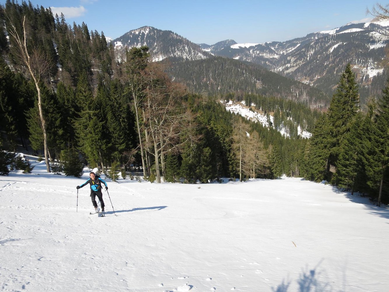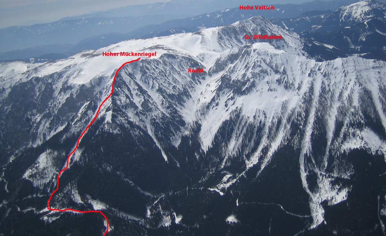 Vom Rodel Skitouren Parkplatz etwas nördlich vom Gasthof "Gamsjaeger" (etwa 3 km östlich der Passhoehe beim Ort Niederalpl) neben der Staße zurück (Richtung Mürzsteg) bis zu einer kleinen Brücke. Auf dieser Brücke über den Bach und ca. 100 m danach links (diesmal ohne Brücke) über den kleineren Bach. Kurz hinauf zur Forststraße und dieser nach links um den Rücken folgen. Dann steil rechts vom Graben zur nächsten Forststraße aufsteigen und dieser nach links, vorbei an einem markanten freien Rücken mit verfallener Hütte (oder Fütterung danach) bis zum baumfreien Lawinenschlag. In diesem Graben hinauf - links kommt bald ein Hochstand - bis zum Grat. Nach 2/3 kommt eine Steilstufe, die man je nach Verhälnissen und Mut rechts umgeht. Dem oft überwechteten Grat je nach Schneelage mit den Skiern Richtung Gipfel folgen (ggf. Skidepot vor dem Gipfel.)