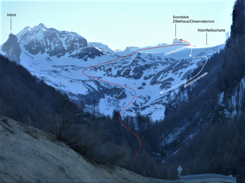 1-2-3- eine superfeine Skitour wünsch` ich mir herbei! Gesucht- Gefunden! Der Sonnblick bietet neben Österreichs höchstem meteorologischen Observatorium auch Skigelände vom Feinsten. Nur anfänglich ein kurzes Stück durch wunderschönen Lärchenwald, führt der überwiegende Teil der Tour über offenes Terrain. Gerade im Frühjahr, wenn es in den Tälern wieder warm wird, sind die Verhältnisse oft am Besten und nicht selten fährt man Pulverschnee und Firn auf ein und demselben Tag. Zudem verleiht das Kleinfleißkees der Tour eine gewisse Würze und ein Hauch von Hochtour kommt auf.