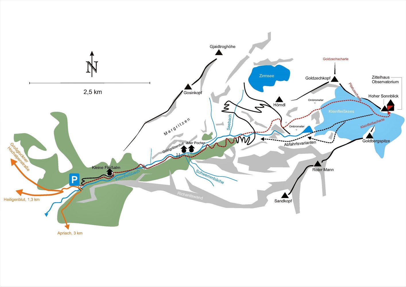 Von der Parkgelegenheit aus folgt man der Straße entlang des Kleinfleißbachs. Nach etwa 200 Metern kommt man zu einer Abzweigung, wo ein hölzerner Wegweiser Richtung Sonnblick weist. Nach weiteren 700 Metern gelangt man zur Kleinfleißalm (Hütten). Immer weiter entlang des Bachs, über eine Brücke und schließlich zum „Goldgräberdorf“ beim „Alten Pocher“ (1809m). Hier gerade weiter auf der Forststraße zum „Zirmseespeicher“. Dabei kann man die Straße immer wieder „abschneiden“ . Im Bereich von etwa 2200 Metern zieht die Straße weit nach links (Westen). Hier folgt man dem Geländeverlauf und steigt entlang des Sommerwegs weiter auf. Auf circa. 2500 Metern trifft man wieder auf die Forststraße, folgt ihr kurz, bis der Sommerweg entlang der Seitenmoräne fortsetzt. Man gelangt auf den Gletscher und erreicht das Gipfelhaus/Observatorium, indem man in einem langen Bogen am linken Rand des „Kleinfleißkees“ aufsteigt.