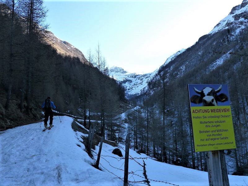 ABFAHRT: Wie Aufstieg. Abfahrtsvariante: Siehe Skizze! Im zentralen Bereich des Gletschers abfahren, auf etwa 2800 Metern beginnt die Steilstufe des Gletschers. Im Sinne der Abfahrt links einfahren, weiter hinunter zum Boden (im Sommer kleiner See) und diesen hinausfahren. Links halten, eventuell kurz „hinausbretteln“. Nun wird es wieder etwas steiler und eine breite Rinne führt hinunter zur Forststraße. Der Rest wie Aufstieg.