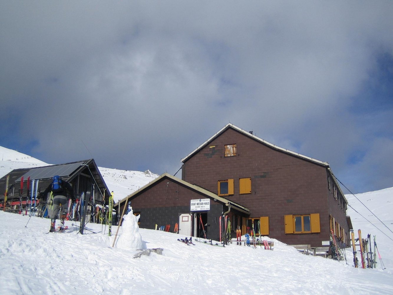 Abfahrt: Wie Aufstieg bis zum Graf-Meran-Haus, dann über den Graben bis zur Stütze des Materialliftes (ca. 200 m südöstlich der Hütte). Ca. 100 m durch eine steile Rinne (IV), dann, im weiten Kar, wird es flacher.