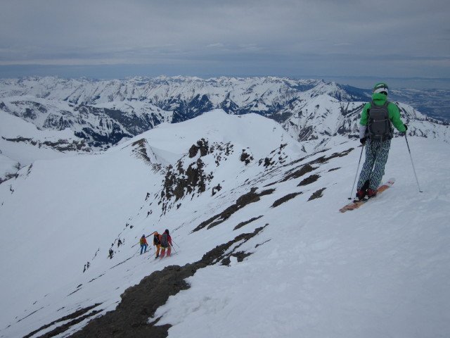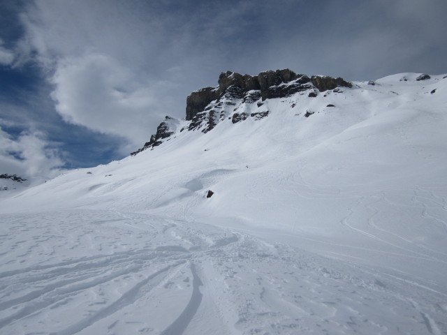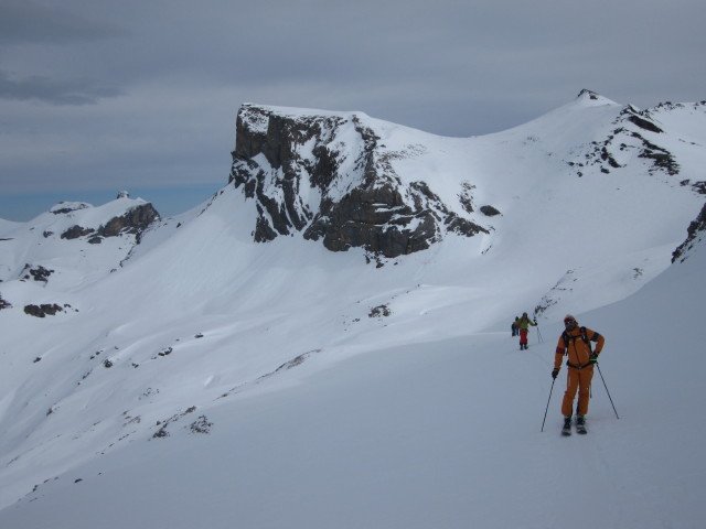 Von der Bergstation am Schilthorn zuerst ein Stück am Westgrat abfahren und dann in dessen steiler Südflanke (Achtung: Absturzgefahr!) zum Sattel Rote Härd (2683 m) traversieren. Hier anfellen und in südwestlicher Richtung rechts des Kamms aufsteigen. In einem kleinen Sattel westlich des Punkts 2860 wechselt man kurz auf die links Seite des Kamms. Zuletzt sehr steil direkt über den Nordostgrat (auf Überwächtung achten) zum Gipfel aufsteigen (evtl. Ski tragen bzw. den Gipfel auslassen).