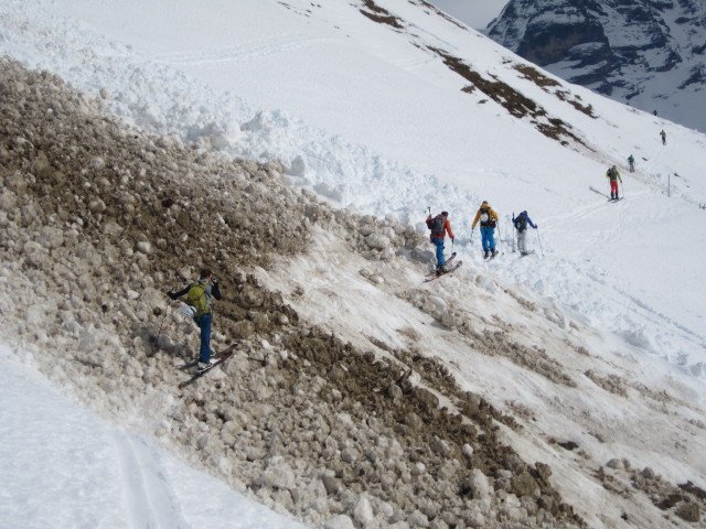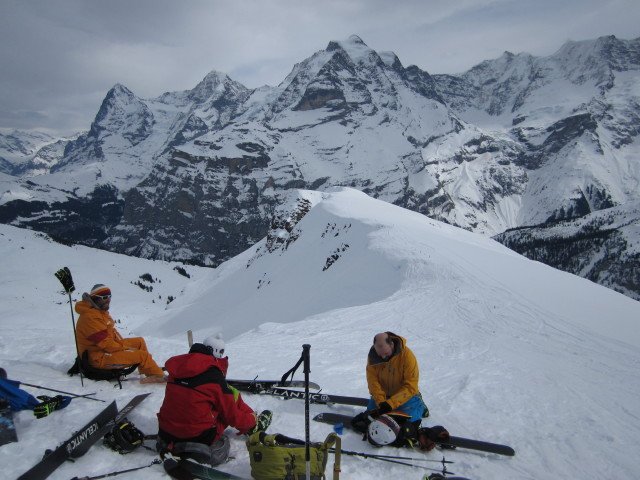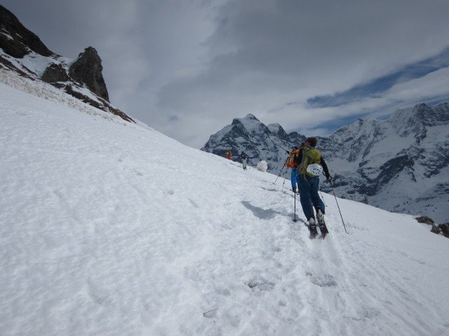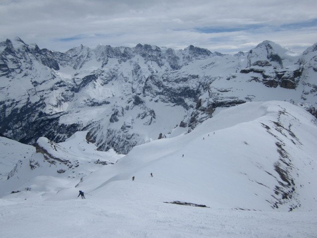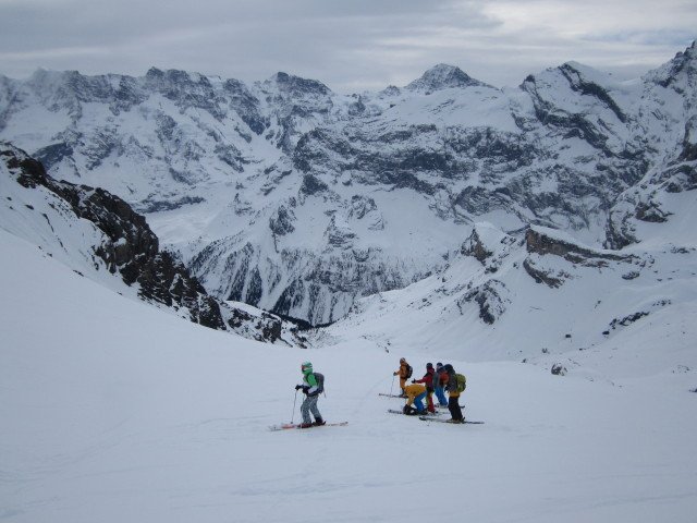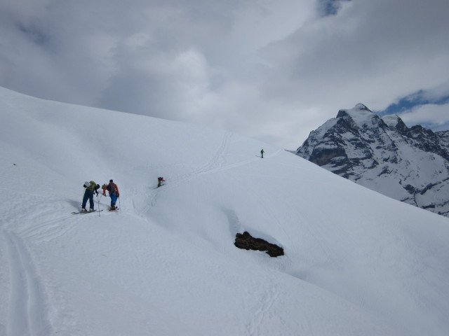 Hier neuerlich anfellen und die Südflanke des Waseneggs auf dessen Rücken ansteigend traversieren. Vom Rücken zuerst kurz steil, dann flacher ins bereits sichtbare Skigebiet abfahren und auf den Skipisten zur Talstation der Schilthornbahn. Bei guter Schneelage kann man bis Gimmelwald (1363 m) abfahren und die Abfahrt so um fast 300 Hm verlängern.