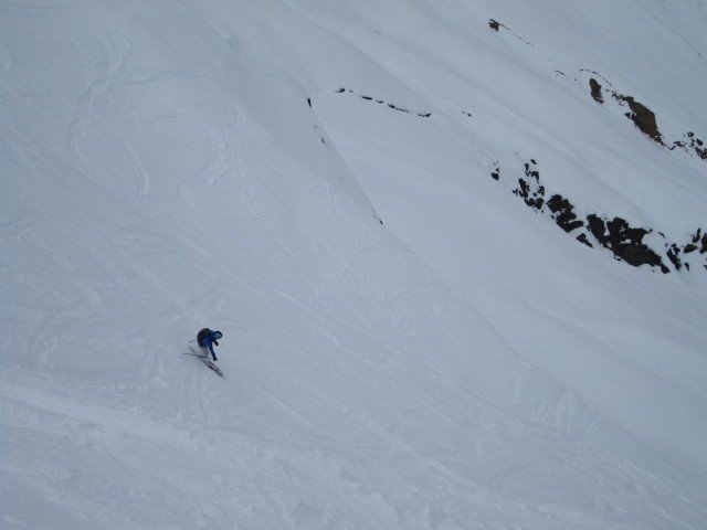 Vom Gipfel in östlicher Richtung durch ein großes Kar ins Tal des Sefibachs abfahren. Je nach Verhältnissen kann das steilste Stück zu Beginn umfahren werden, indem man zuerst dem breiten Rücken in südöstlicher Richtung folgt und erst dann in das große Kar einfährt. Links des Talbodens über mehrere Geländestufen links an der Rotstockhütte vorbei.