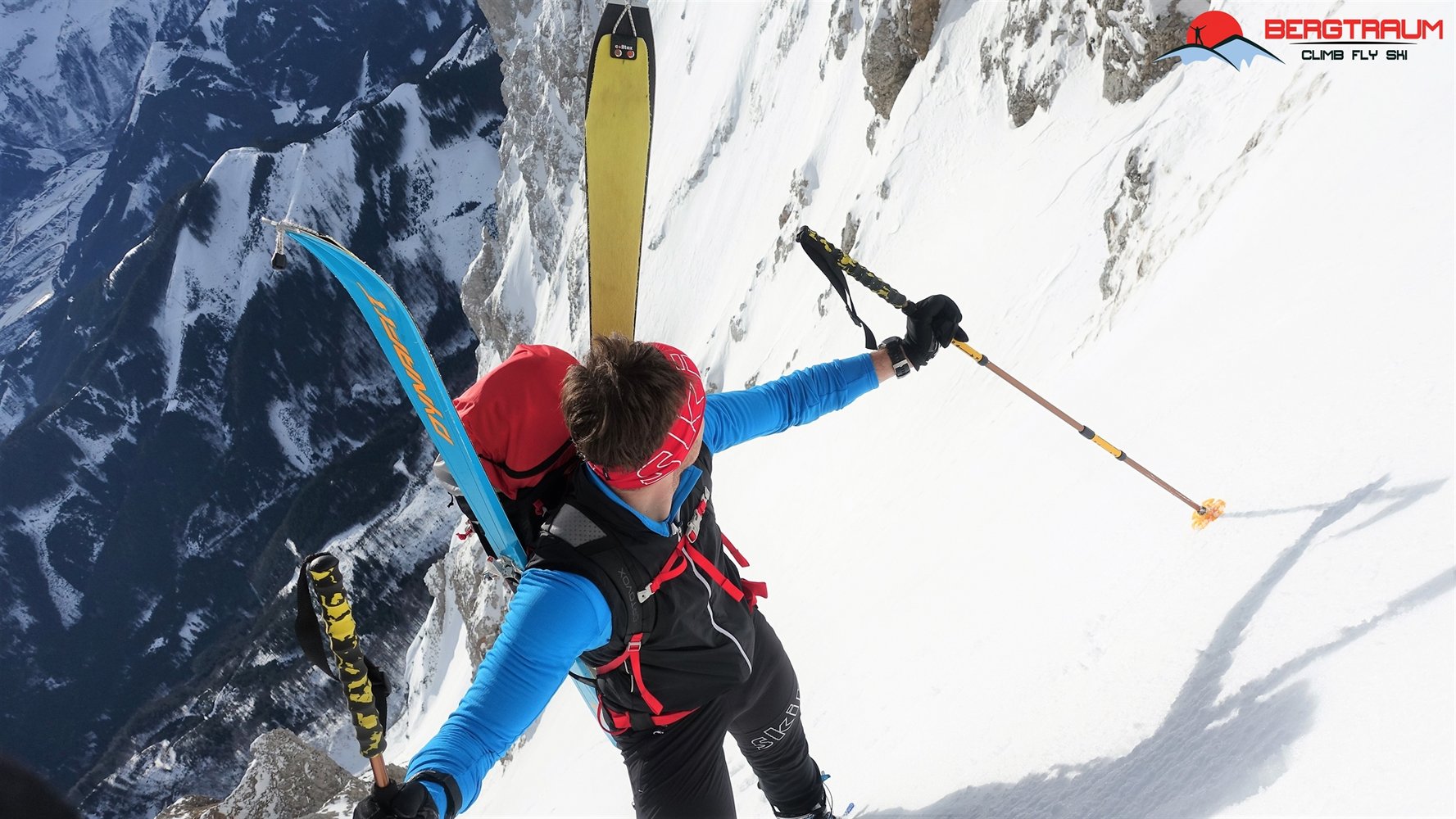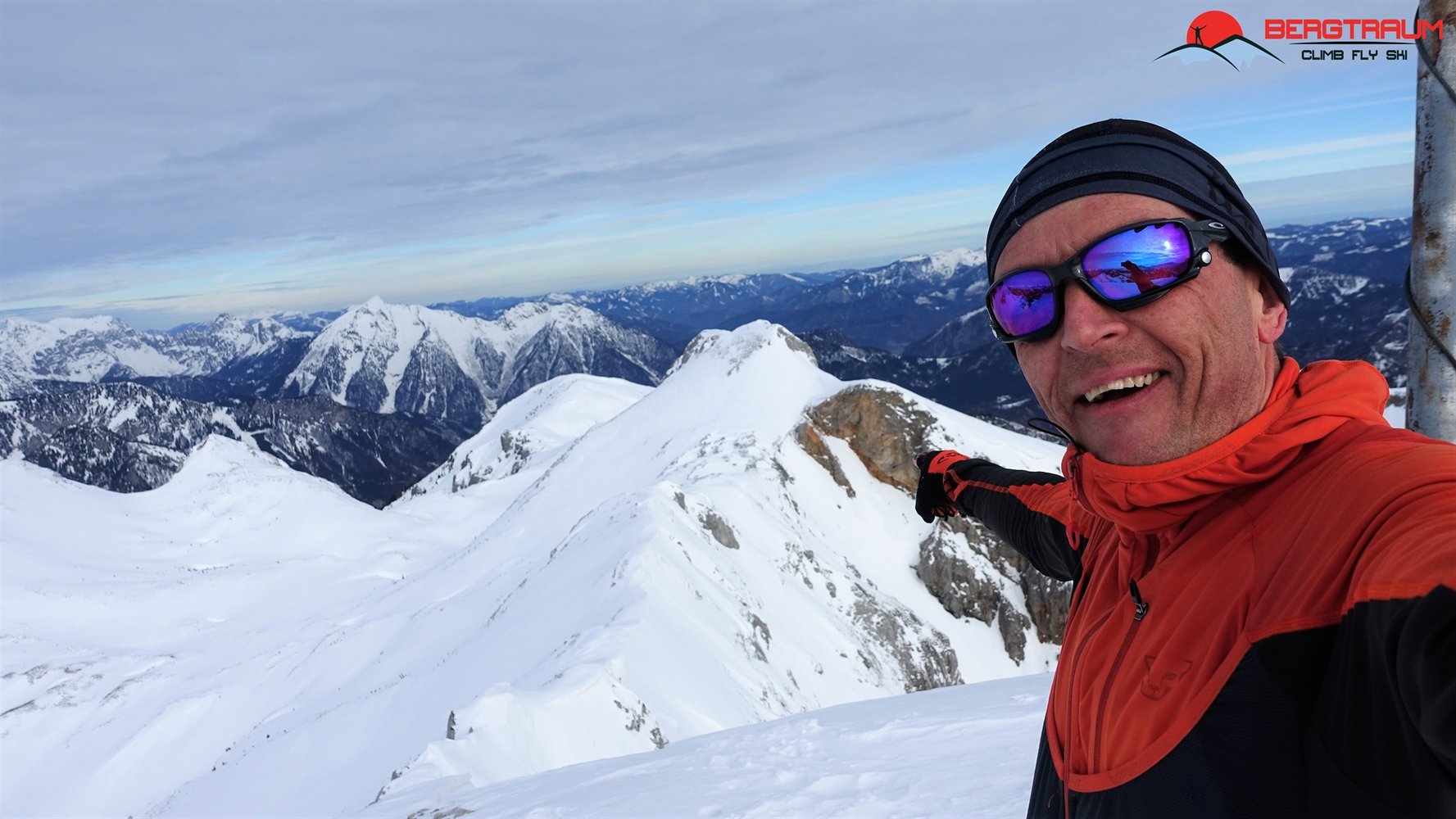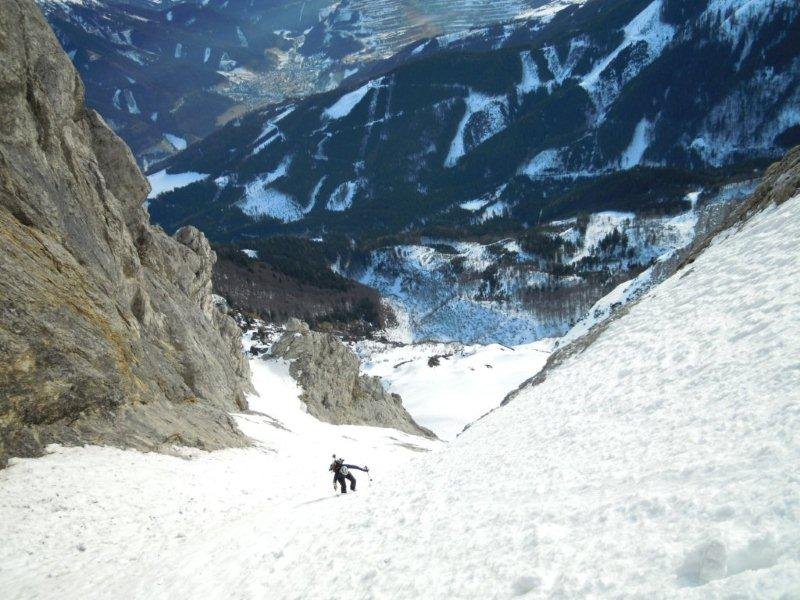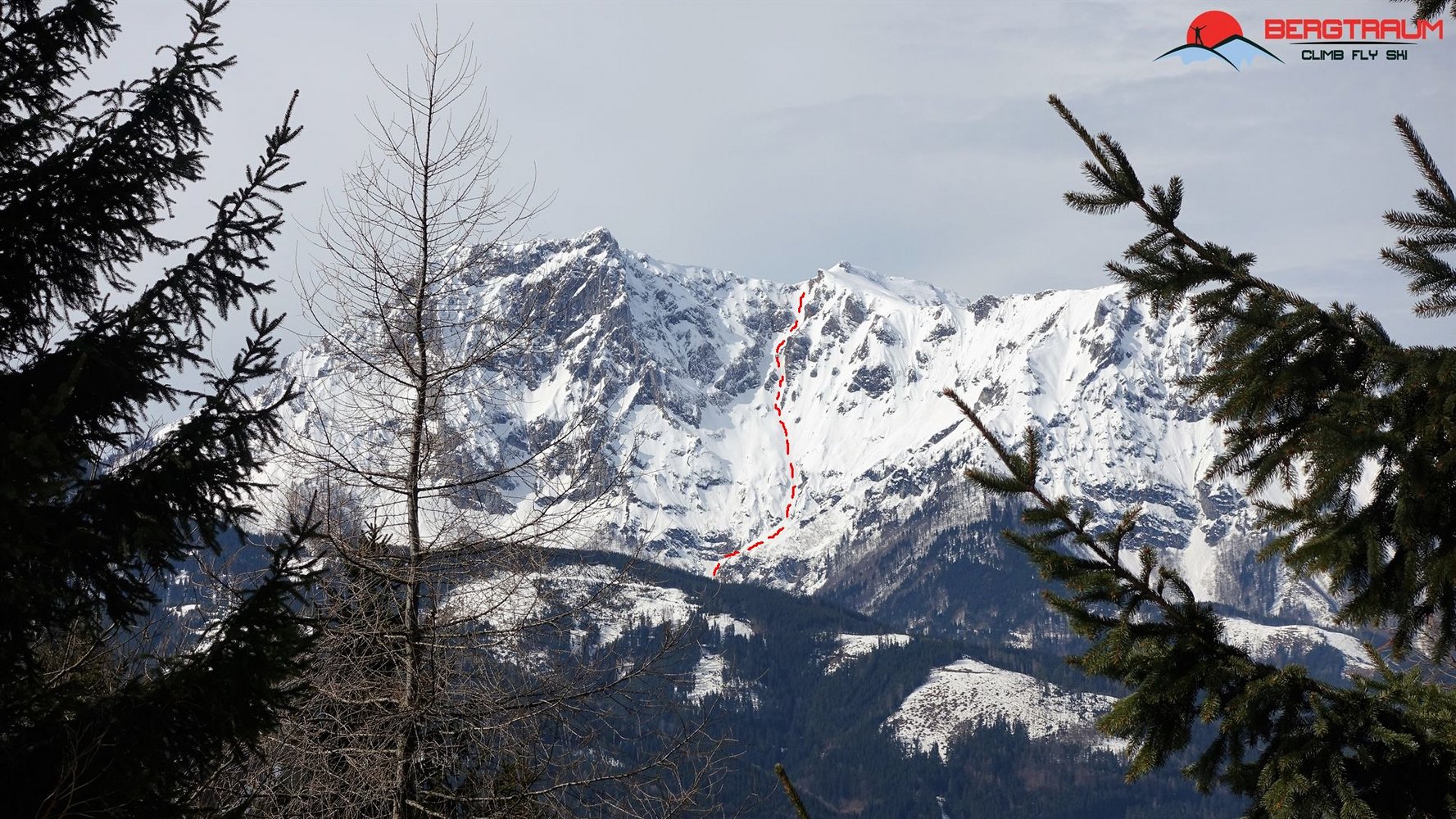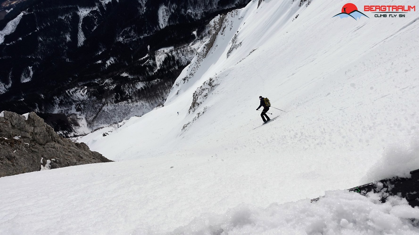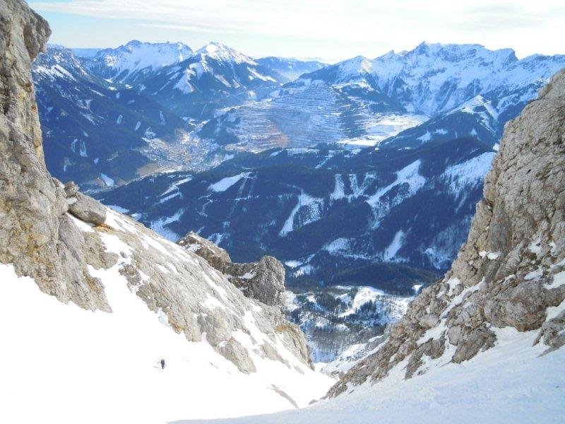 Vom Gipfel des Kaiserschilds ist der Einfahrtsbereicht der Roten Rinne gut einzusehen. Wegen der Steilheit ist diese Frühjahrsskitour nur für erfahrene Skialpinisten geeingnet!