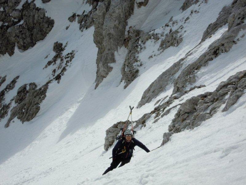 Sehr seitle, alpine Skitour durch die Rote Rinne auf das Kaiserschild. Die Rote Rinne ist eine eindrucksvolle Steilabfahrt an der Ostseite des Kaiserschildes, mit längeren Passagen zwischen 40 und 45 Grad. Kurz vor dem Ausstieg hat es einmal kurz 48°!