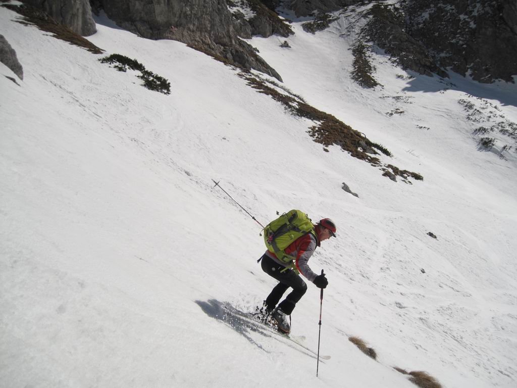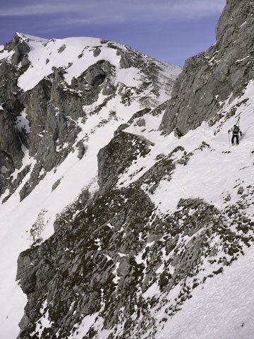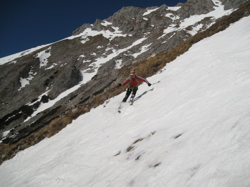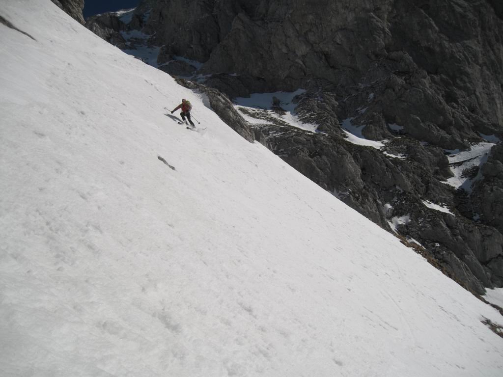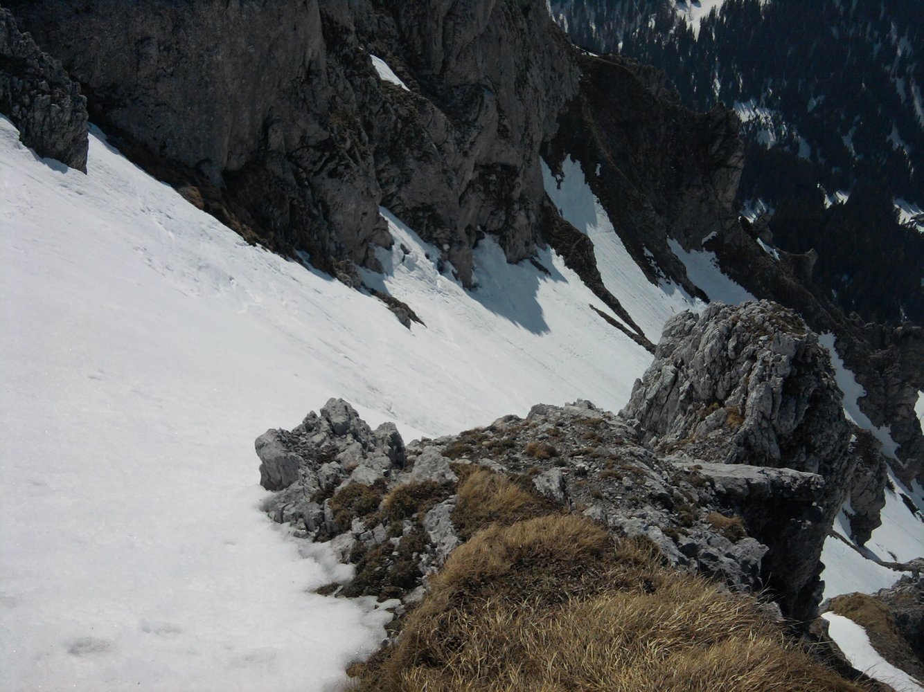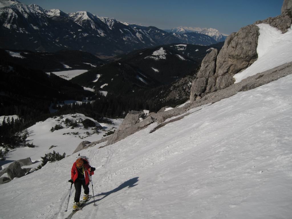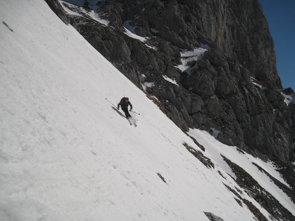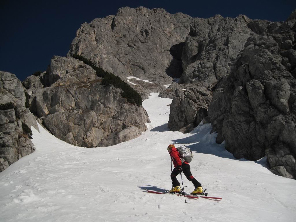 Querung unter der Kalbling Westwand ist steil und exponiert. Steigeisen und event. Pickel notwendig, wenn hart, was auch aufgrund der Westlage oft der Fall ist!