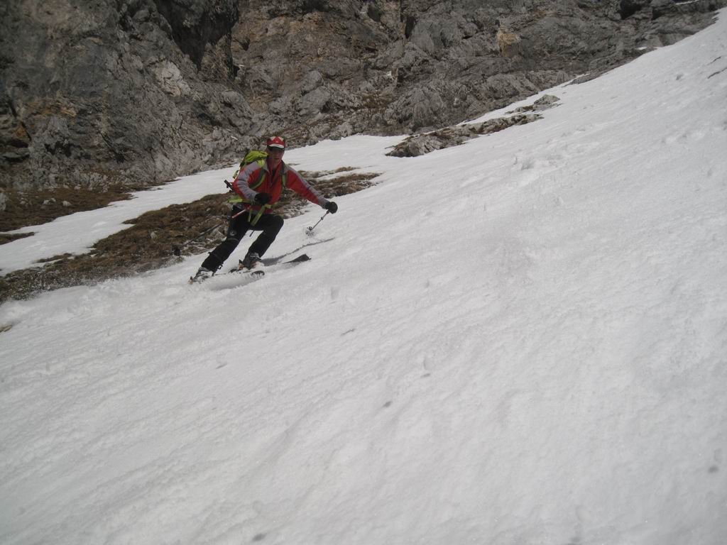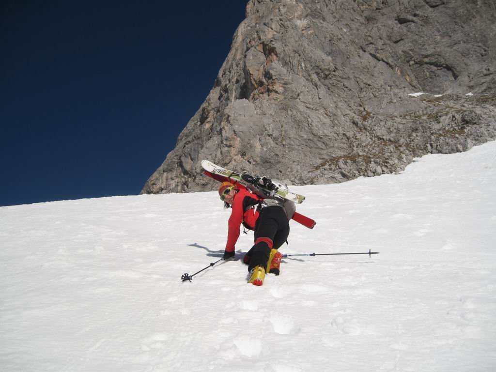 Abfahrt: Die Aufststiegsspur zurück bis zum Beginn der Westwandausläufer. Nun steil (40°) und recht eng in die Eisgrube und weiter zur Hütte. Ab hier wieder über die Aufstiegspur zurück.