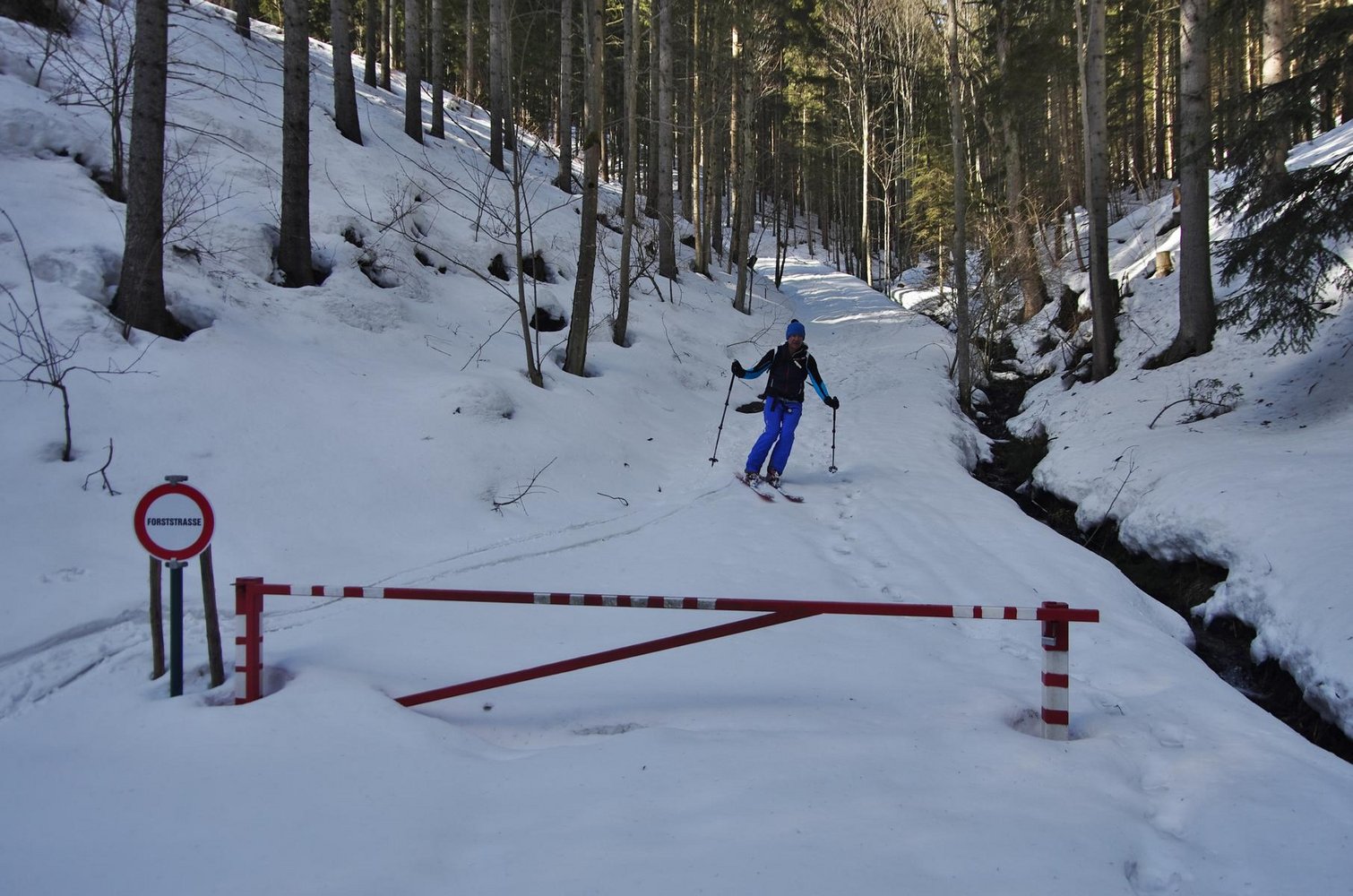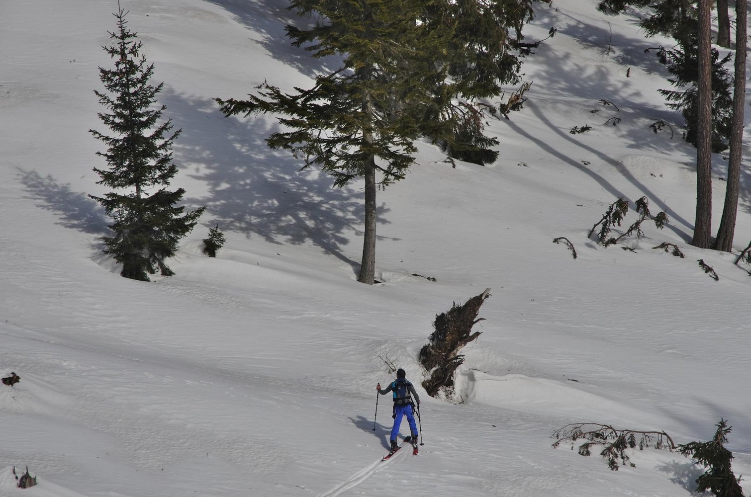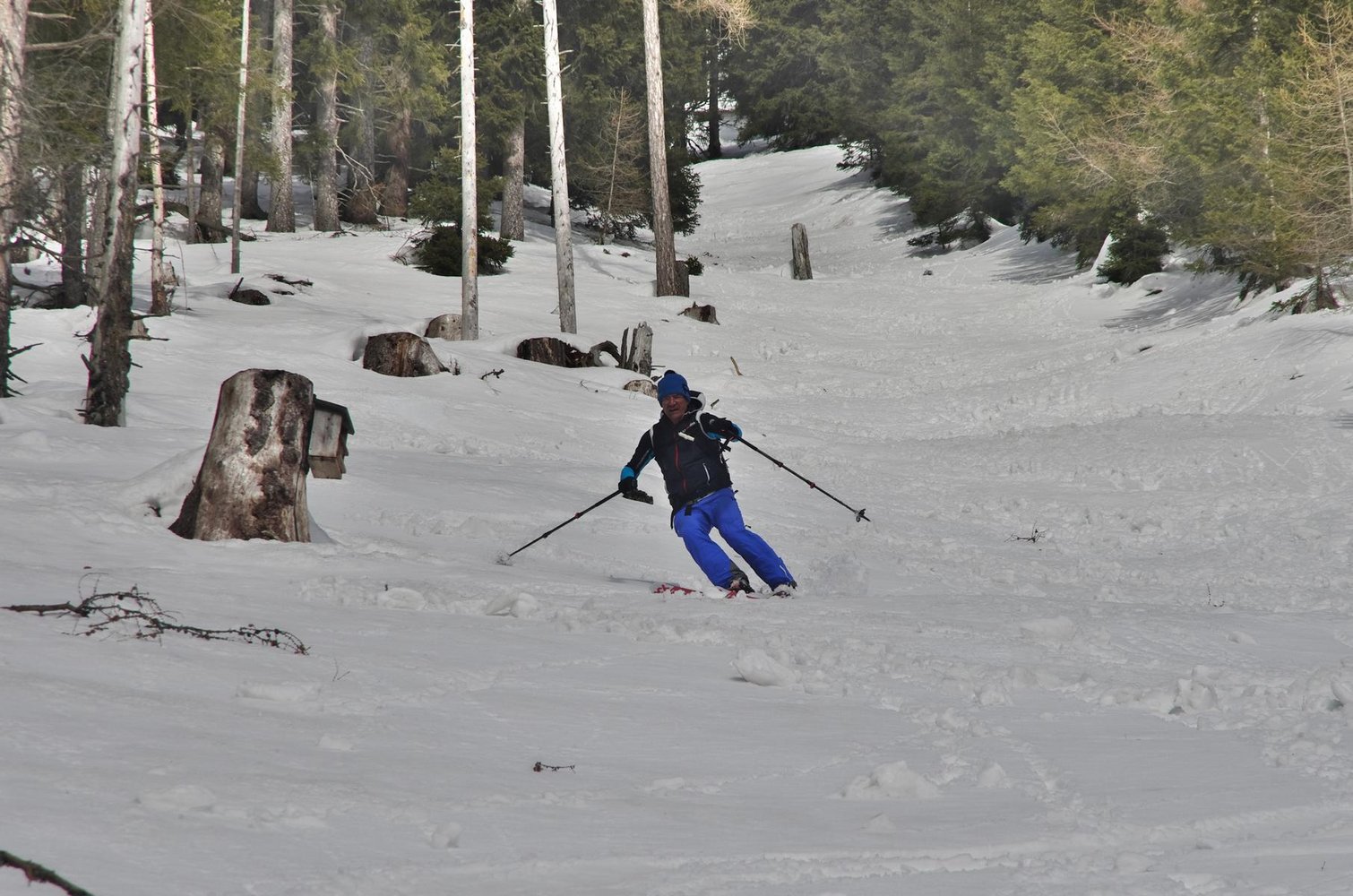 1) Wie Aufstieg und je nach Belieben orographisch links in den Graben abfahren. Erstmals ist in der ersten großen flachen Mulde sinnvoll. Die Engstelle unten im Graben wird rechts umfahren.