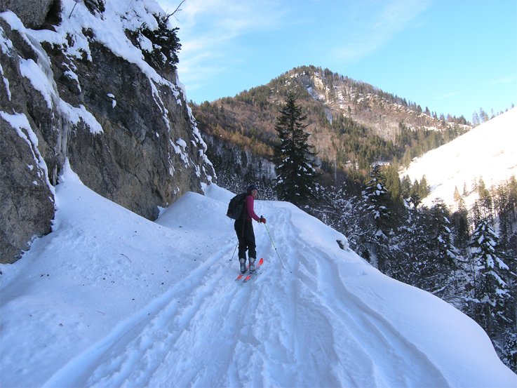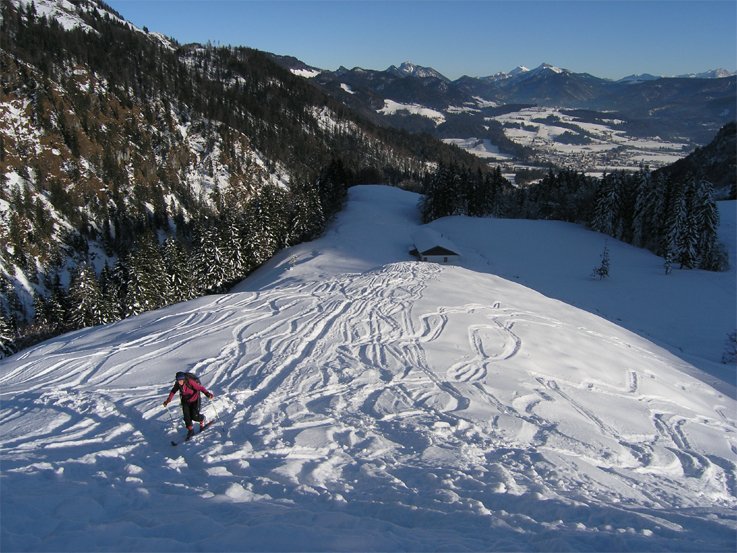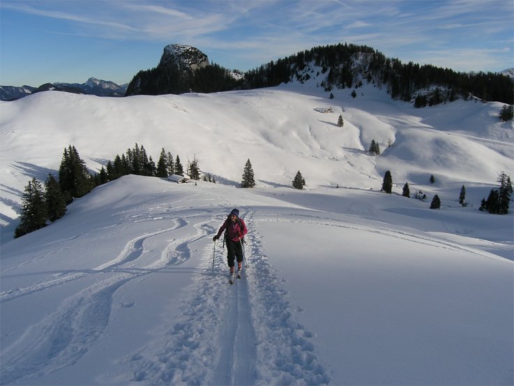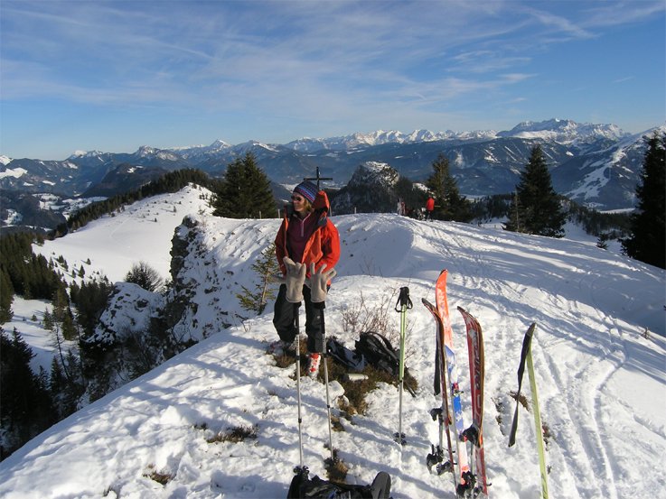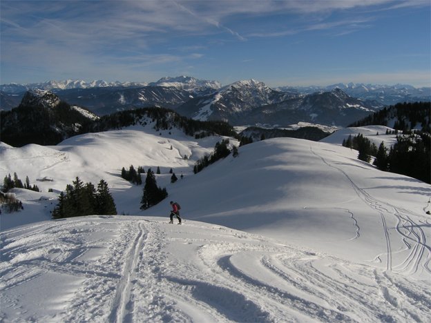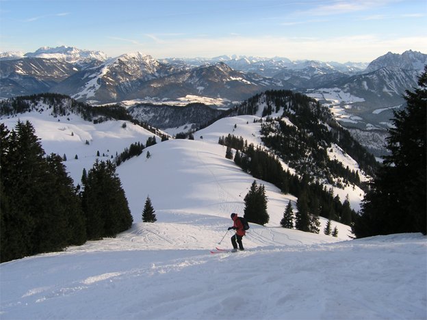 Schöne Anfängerschitour, die unten über ein aufgelassenes Schigebiet und oben über schöne, buckelige Hügel führt. Vom Gipfel hat man eine fantastische Sicht ins Kaisergebirge.