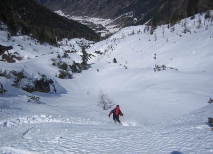Die Abfahrt entlohnt für den mühevollen Zustieg im unteren Teil. Orientierungsinn bei fehlender Spur unerlässlich. Bei der Abfahrt ab 1700 m NN auf keinen Fall den richtigen Rücken verpassen! Steilabbrüche bei Verfehlen des richtigen Weges!
